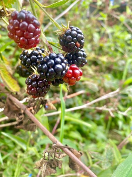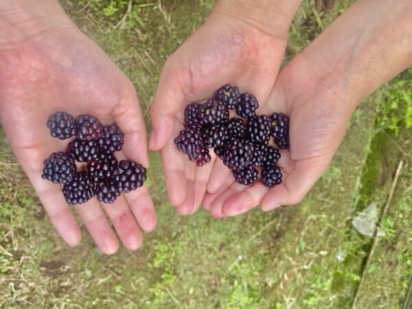 家の裏庭に行くとブラックベリーという黒い木苺のような果物が植っているので、姉と一緒に収穫しに行きました。🍓