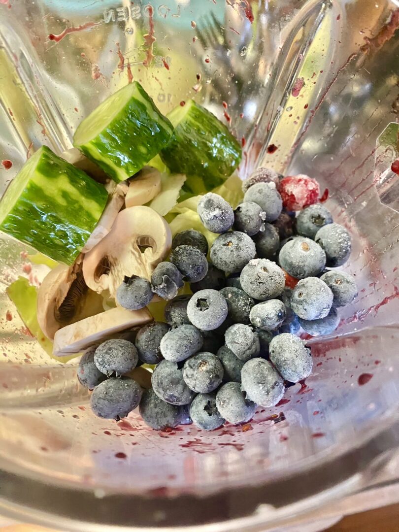 ブラックベリーの他にブルーベリーや木苺、レタスやきゅうり、マッシュルームなどを一緒に入れてミキシング!