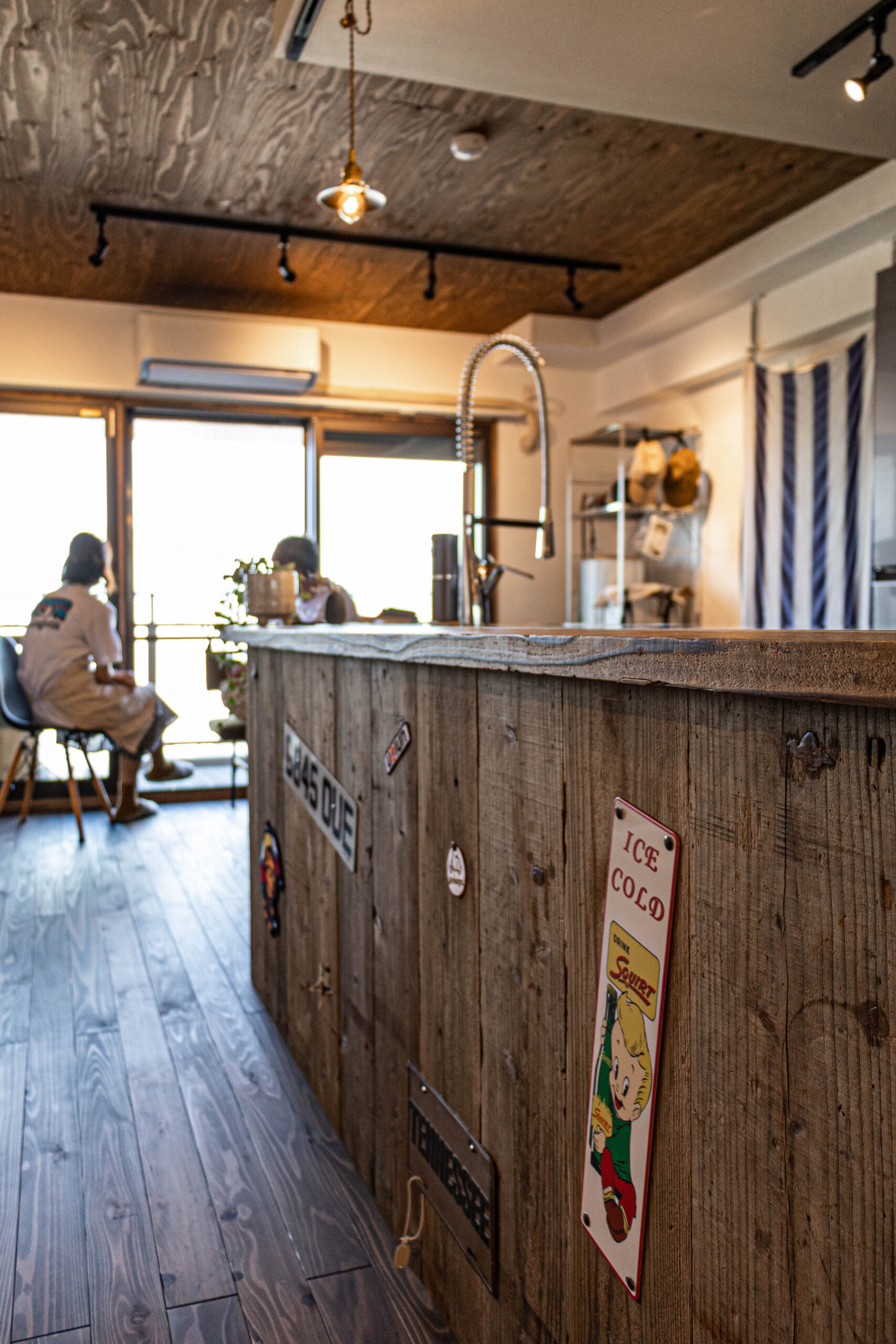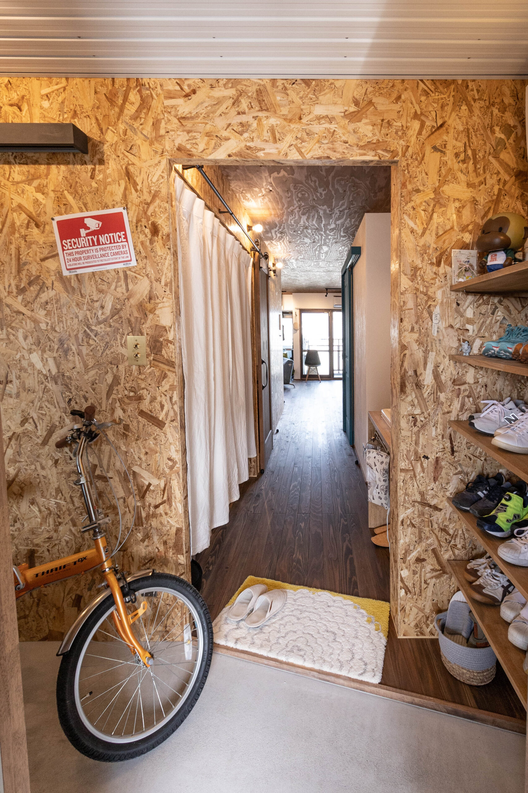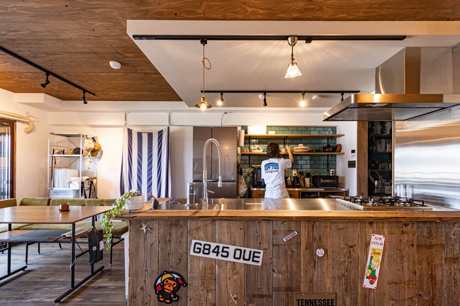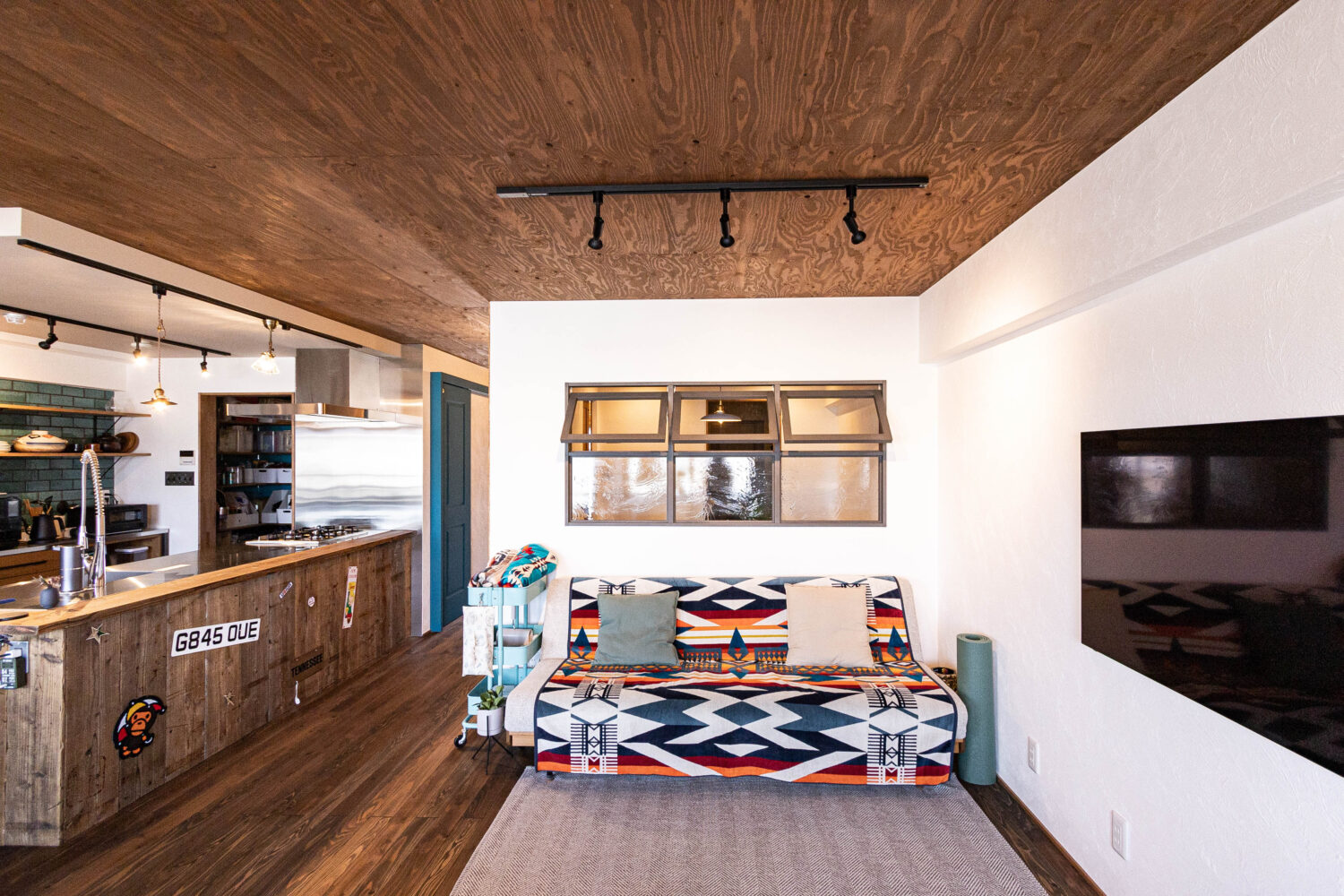 ご夫婦が求めたのは、日常生活をただ過ごすだけの場所ではなく、趣味やこだわりが詰まった「自分たちが心からリラックスできる場所」。リノベーションで3LDKだった間取りを大胆に1LDKへと変更し、広々としたリビングと開放感のある空間を作り出しました。家全体にアメリカンレトロのスタイルを取り入れ、リビングや土間玄関には倉庫のような無骨でかっこいいデザインを採用。趣味のアイテムを飾れるスペースも設け、インダストリアルな雰囲気が漂います。