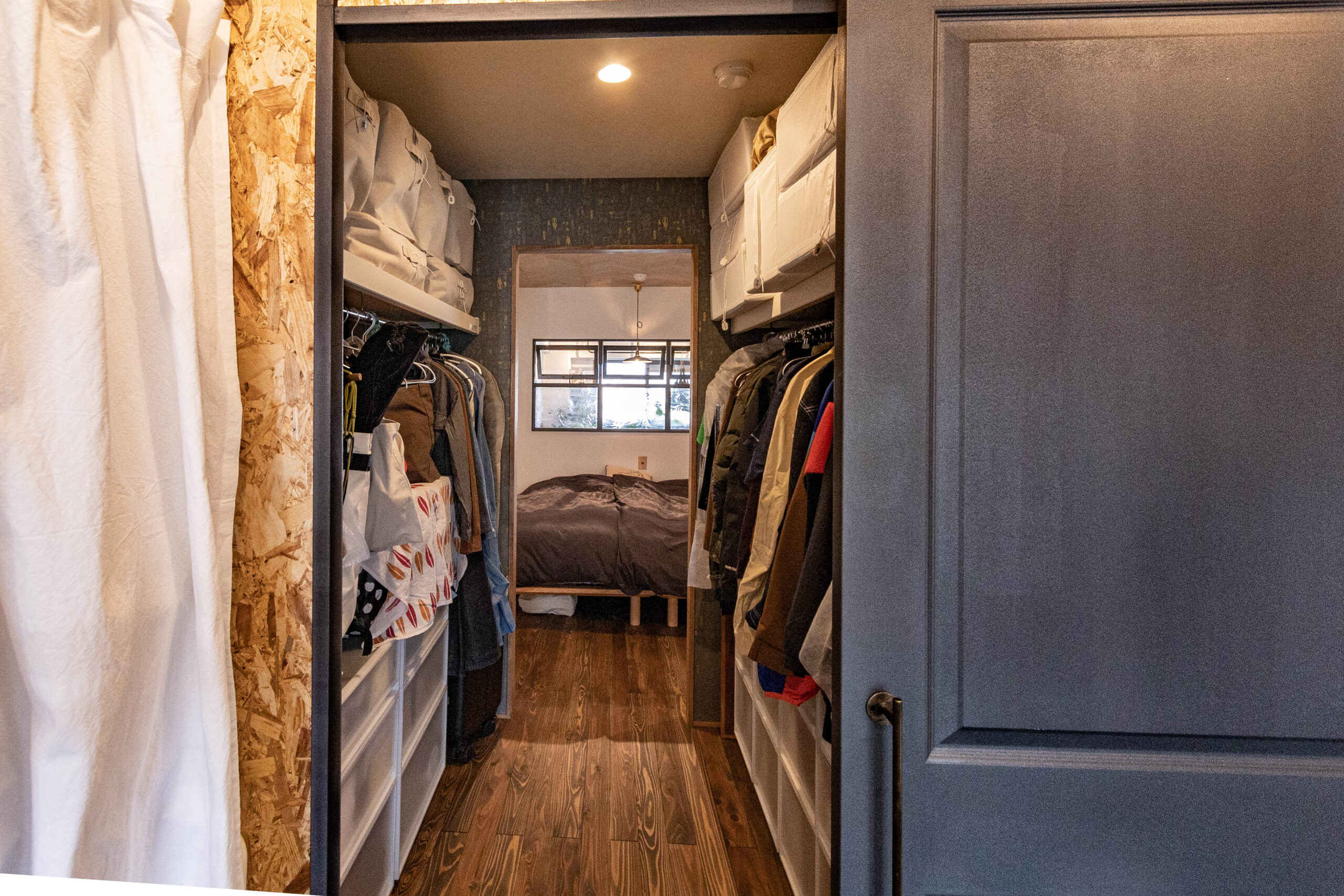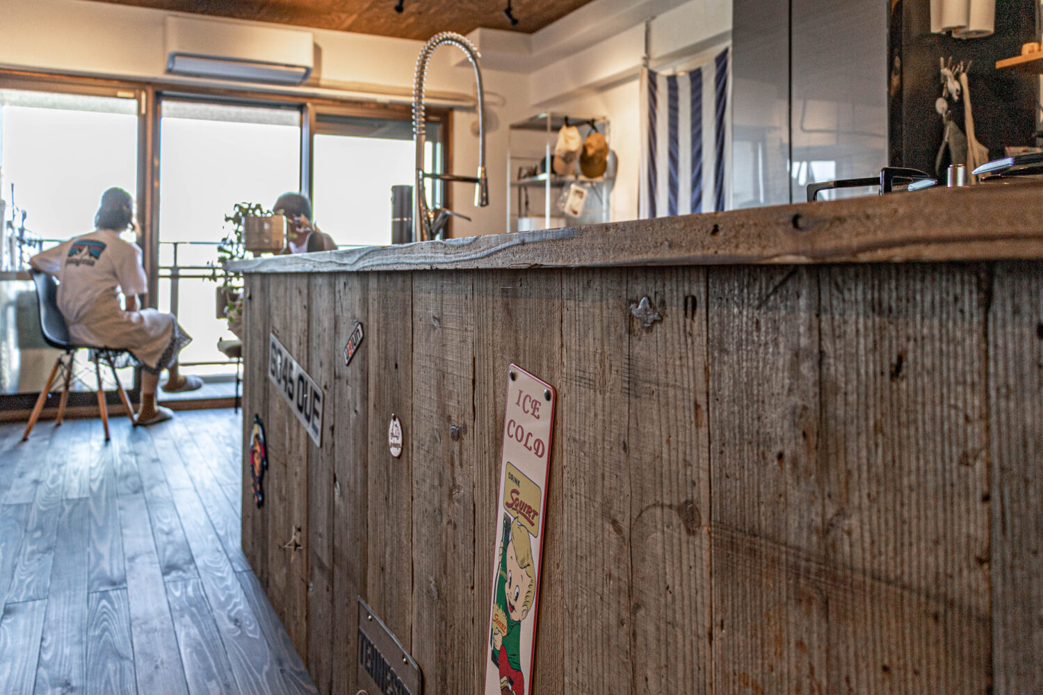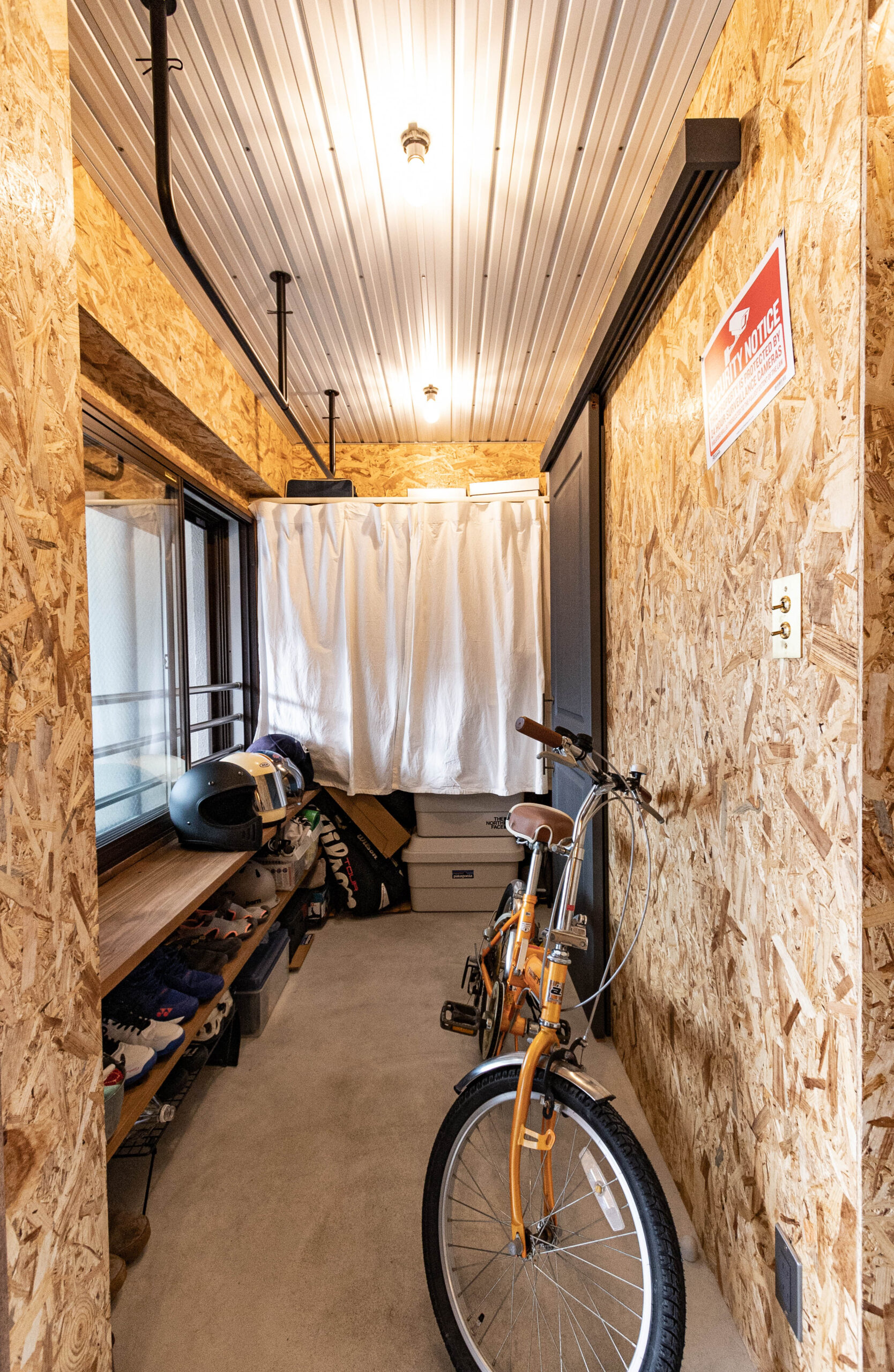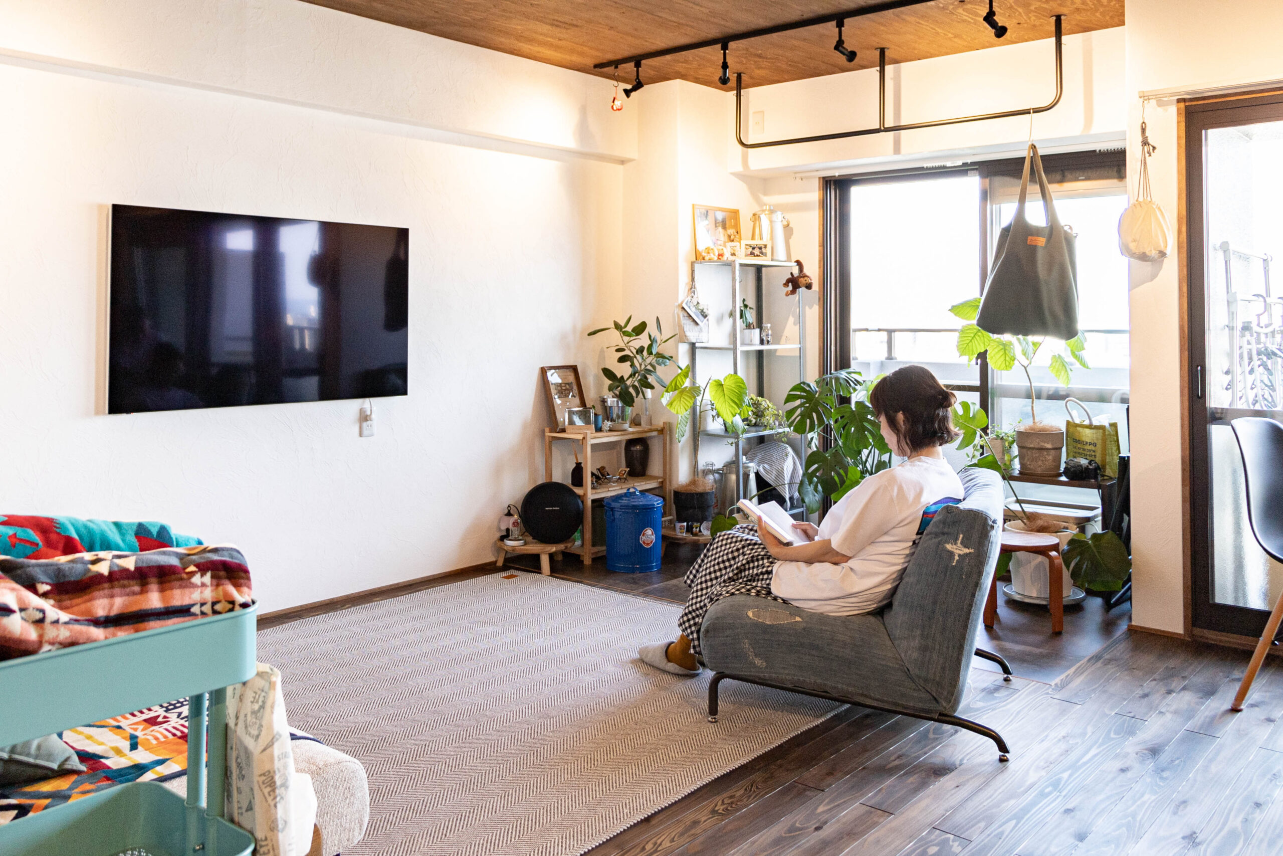 ご夫婦が求めたのは、日常生活をただ過ごすだけの場所ではなく、趣味やこだわりが詰まった「自分たちが心からリラックスできる場所」。リノベーションで3LDKだった間取りを大胆に1LDKへと変更し、広々としたリビングと開放感のある空間を作り出しました。家全体にアメリカンレトロのスタイルを取り入れ、リビングや土間玄関には倉庫のような無骨でかっこいいデザインを採用。趣味のアイテムを飾れるスペースも設け、インダストリアルな雰囲気が漂います。