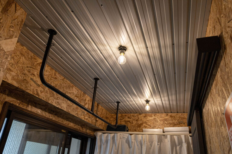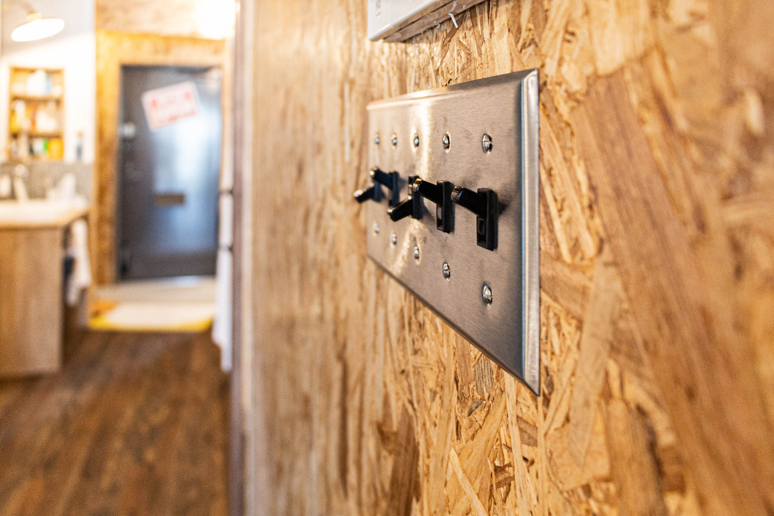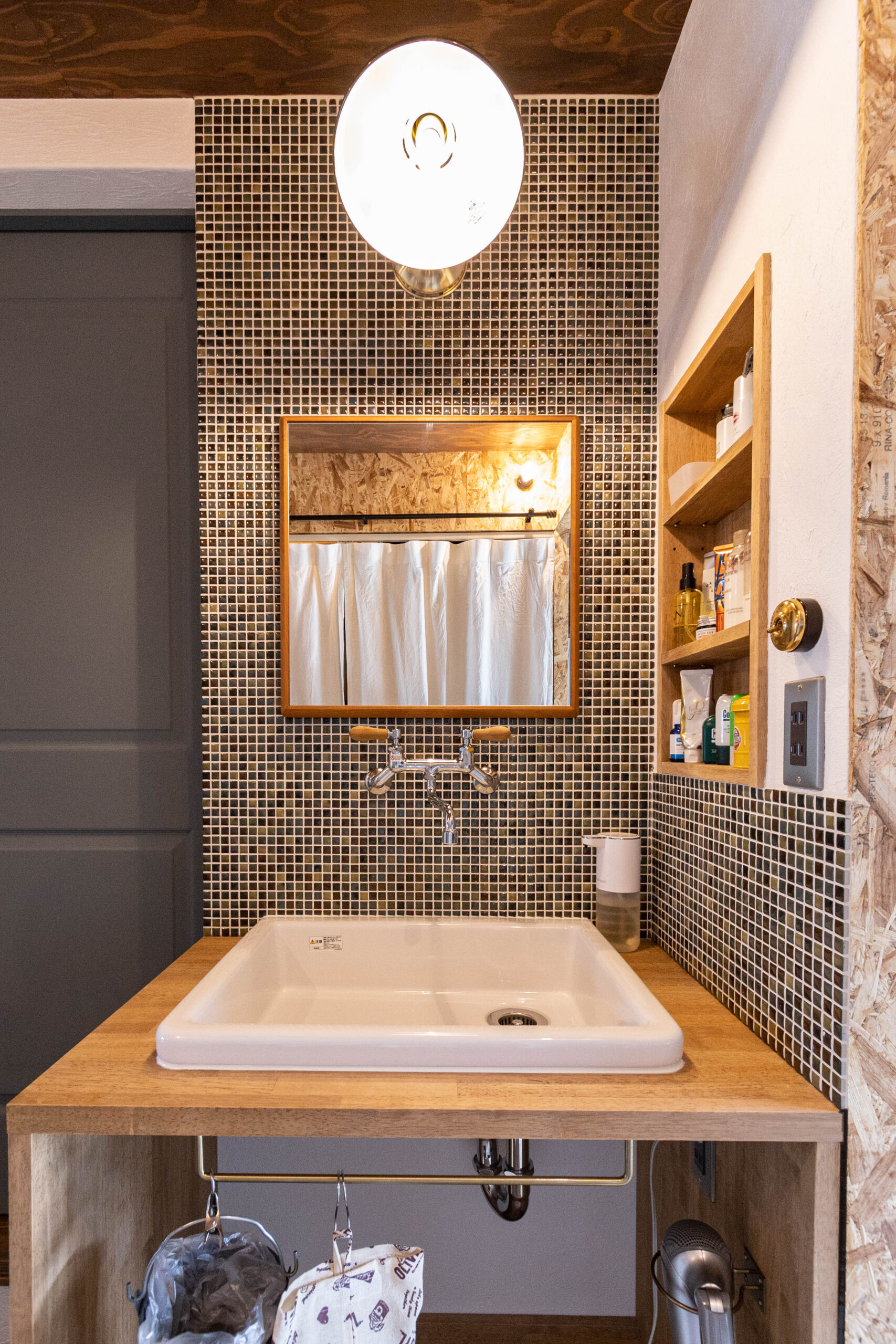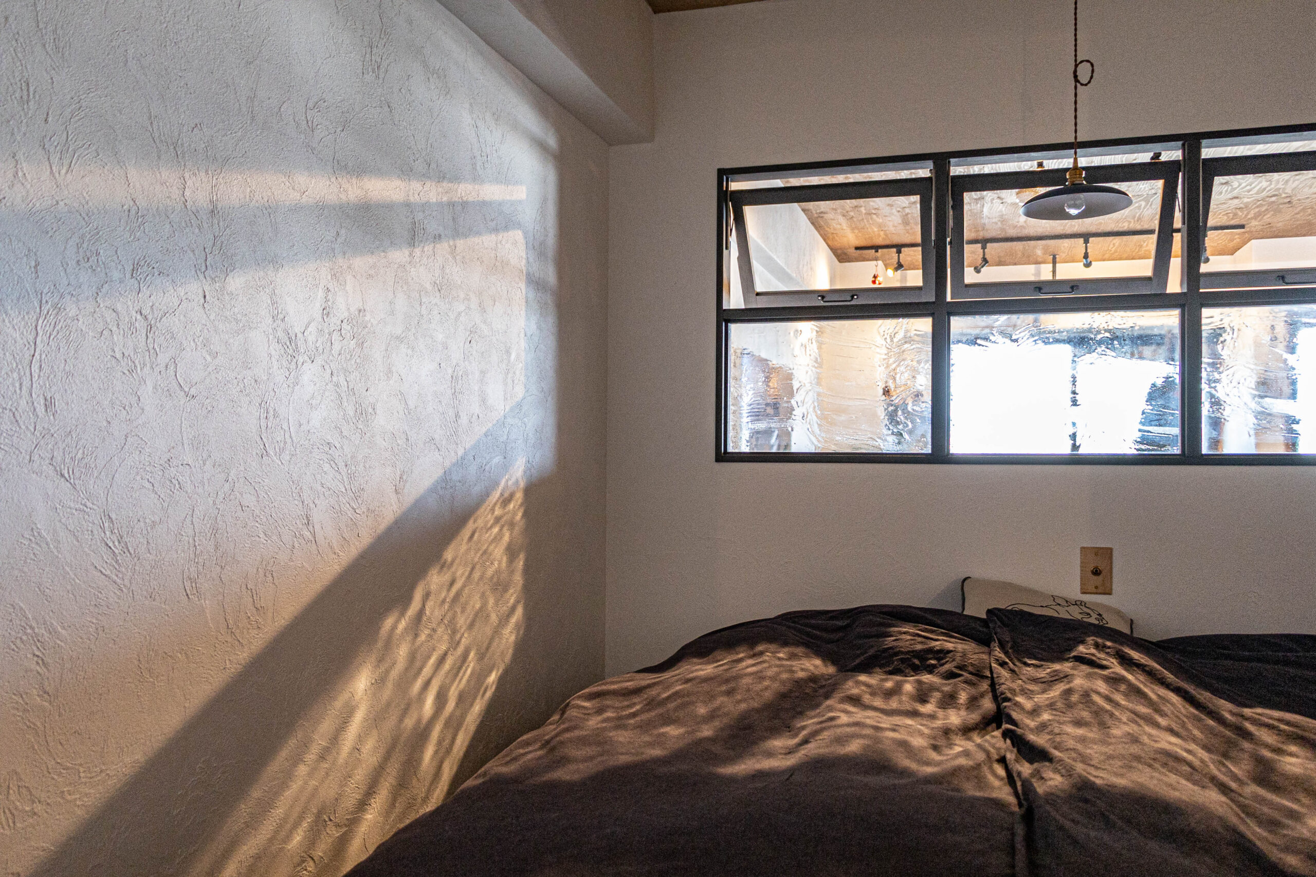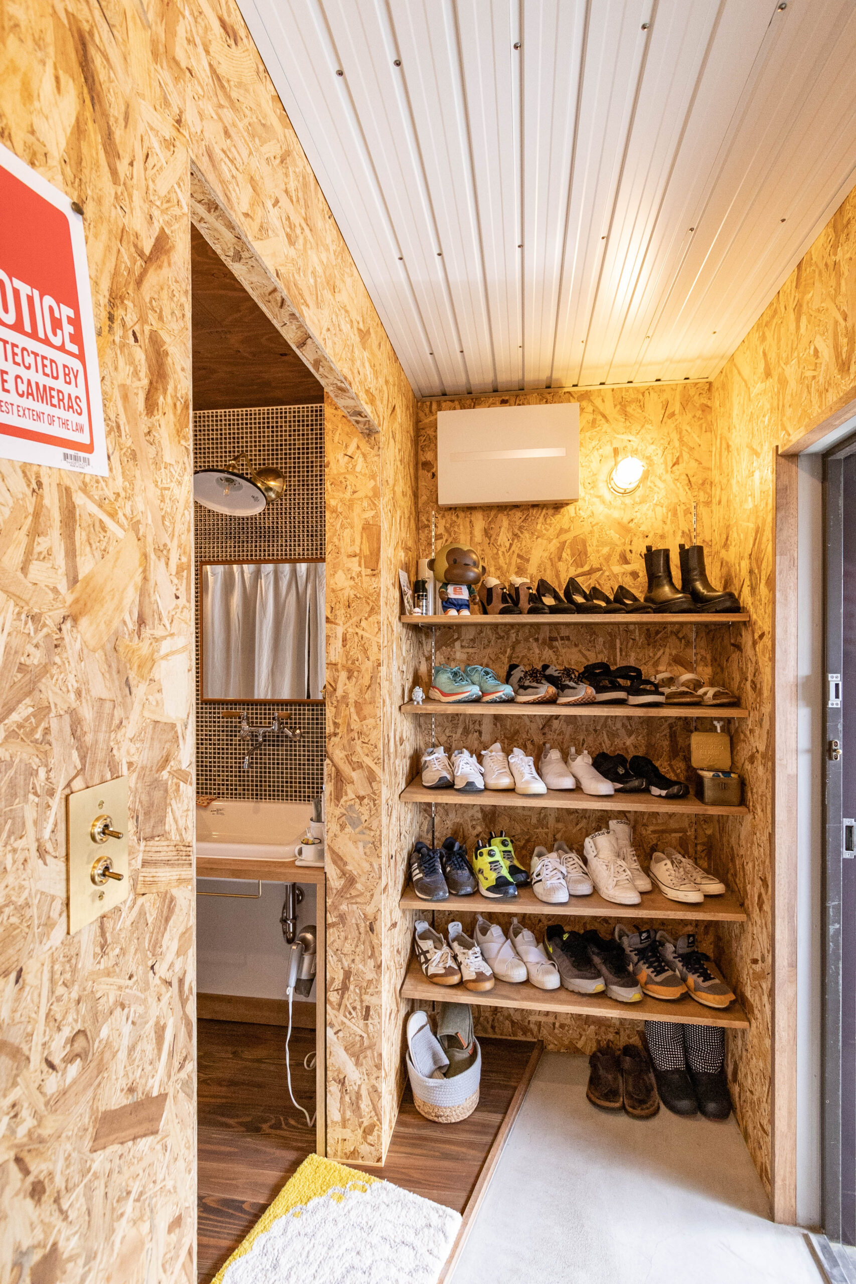 ご夫婦が求めたのは、日常生活をただ過ごすだけの場所ではなく、趣味やこだわりが詰まった「自分たちが心からリラックスできる場所」。リノベーションで3LDKだった間取りを大胆に1LDKへと変更し、広々としたリビングと開放感のある空間を作り出しました。家全体にアメリカンレトロのスタイルを取り入れ、リビングや土間玄関には倉庫のような無骨でかっこいいデザインを採用。趣味のアイテムを飾れるスペースも設け、インダストリアルな雰囲気が漂います。