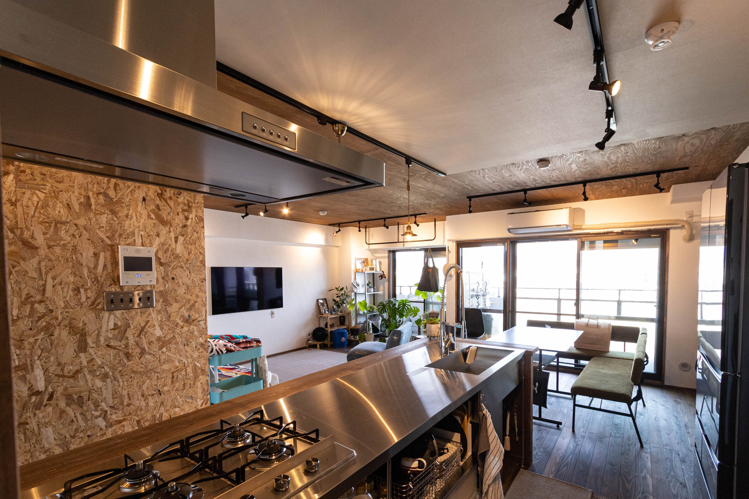 「自分たちが心から楽しめる空間で毎日健康で過ごしたい」という思いを抱き、中古マンションの購入とリノベーションを決意されました。奥様はリノベをするなら楽しそうなミセガマエヤで!と以前から思っておられたとのこと。眺望が良く、光と風が心地よいマンションに出会い、植物が好きな奥様と、倉庫のようなかっこいい空間が好みのご主人とのそれぞれの思いを形にした空間で心地よい時間を過ごす新しい生活が始まりました。