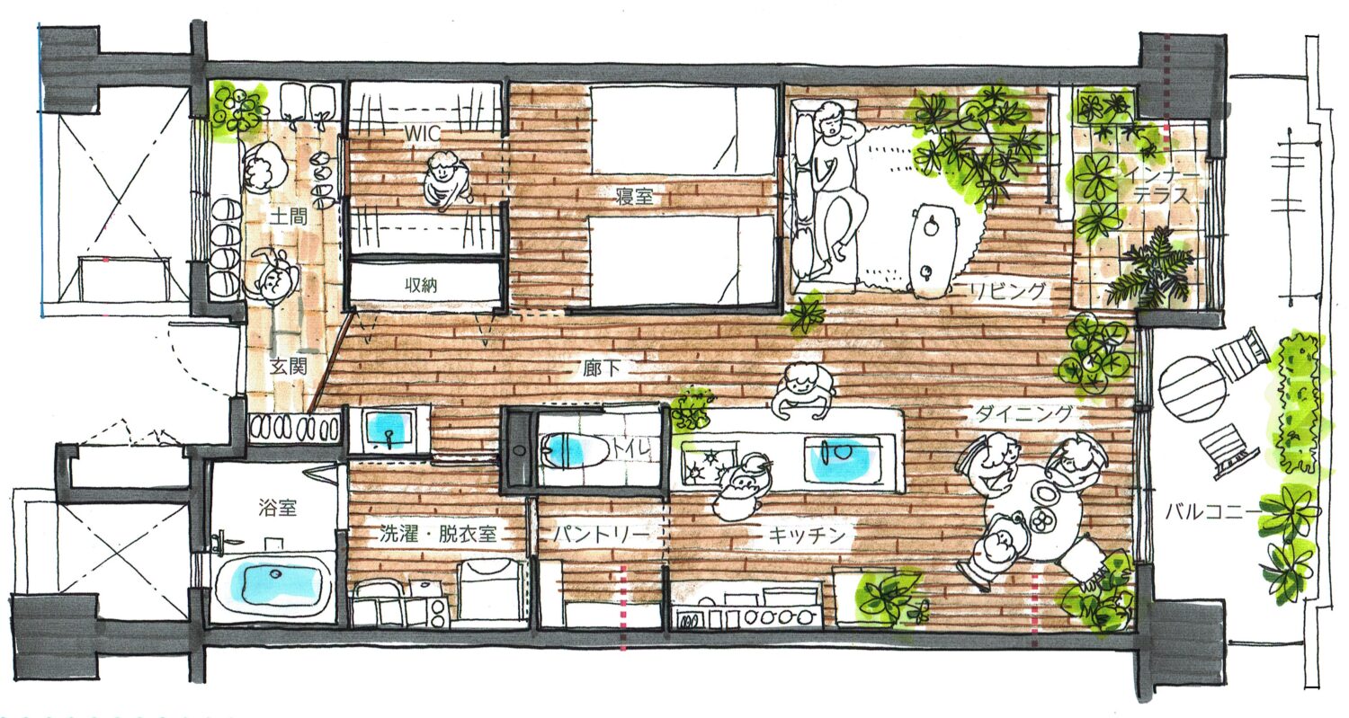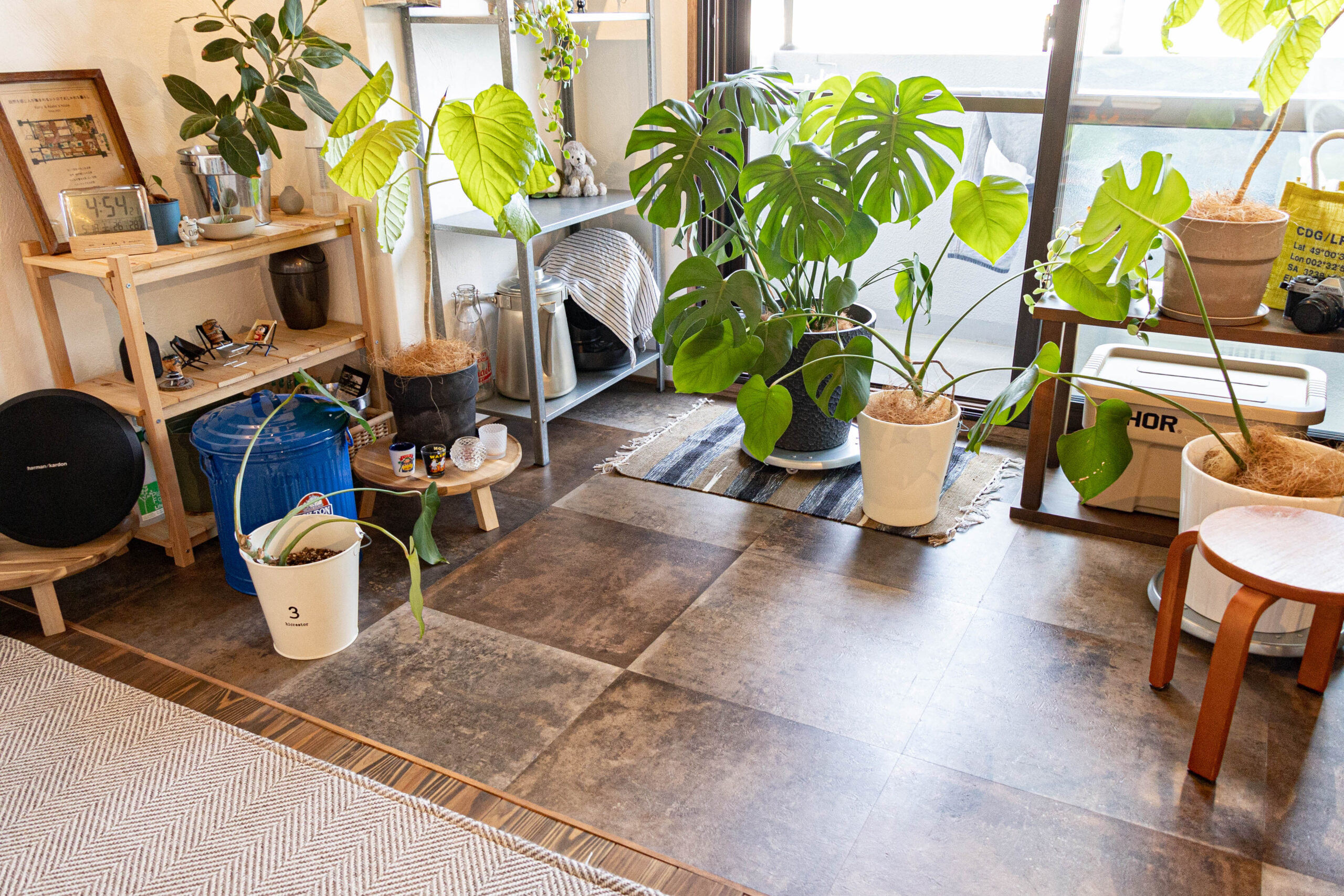 • 植物を楽しむインナーテラス:植物のお手入れがしやすいよう、リビングの一角の床をタイル張りに。