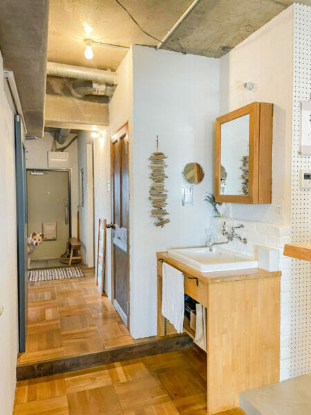 そしてお次は、「洗面台inリビング」。洗面台がリビングにあることで、狭い洗面所で2人で混雑しながら準備せずに、広々開放的に準備することができます◎