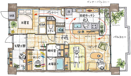 2つ目の仕掛けは、「回遊導線で収納たっぷりキッチン」です。