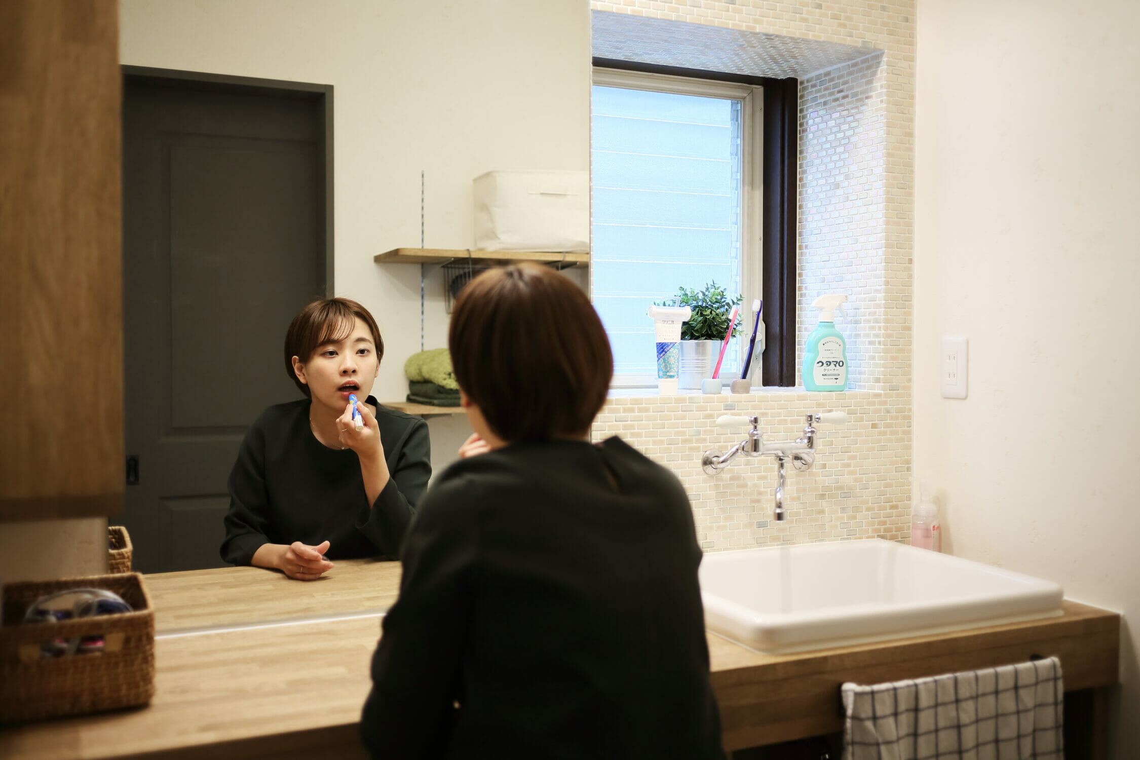洗濯機を思い切って廊下に出したことで、洗面脱衣室にゆとりができ、ゆったりと座ってメイクやスキンケアができるようになりました🥰