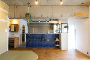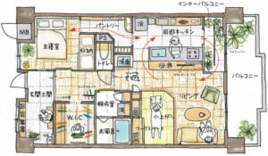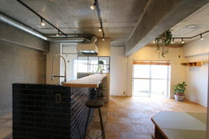 キッチンはご夫婦2人が仲良く料理できるように広々しています。インナーバルコニーのところも通れるようになっており、回遊同線なので混雑することも無さそう。こんなおしゃれなキッチンだったらおしゃれ料理にも挑戦したくなりますね🍳💕