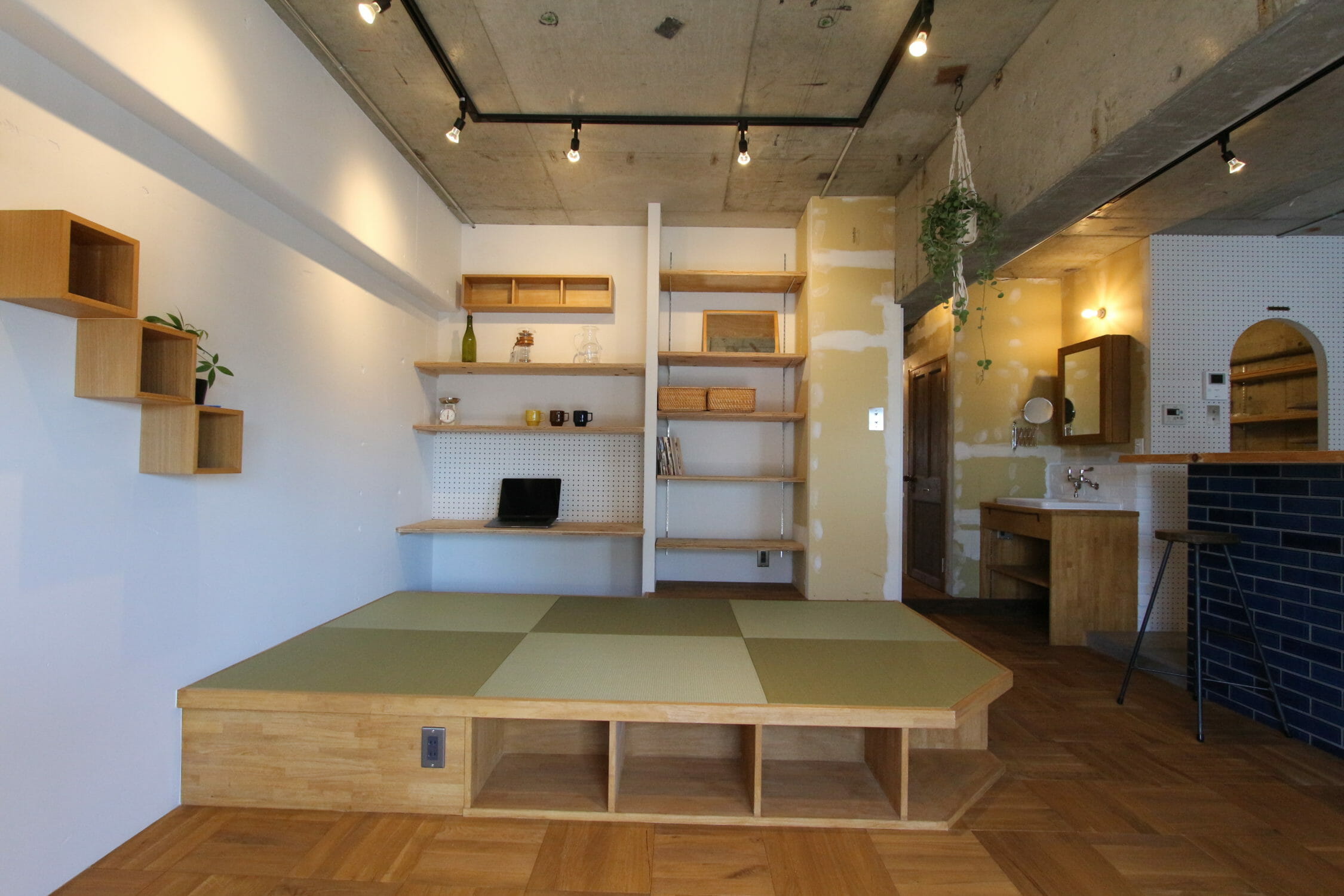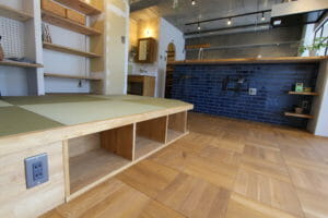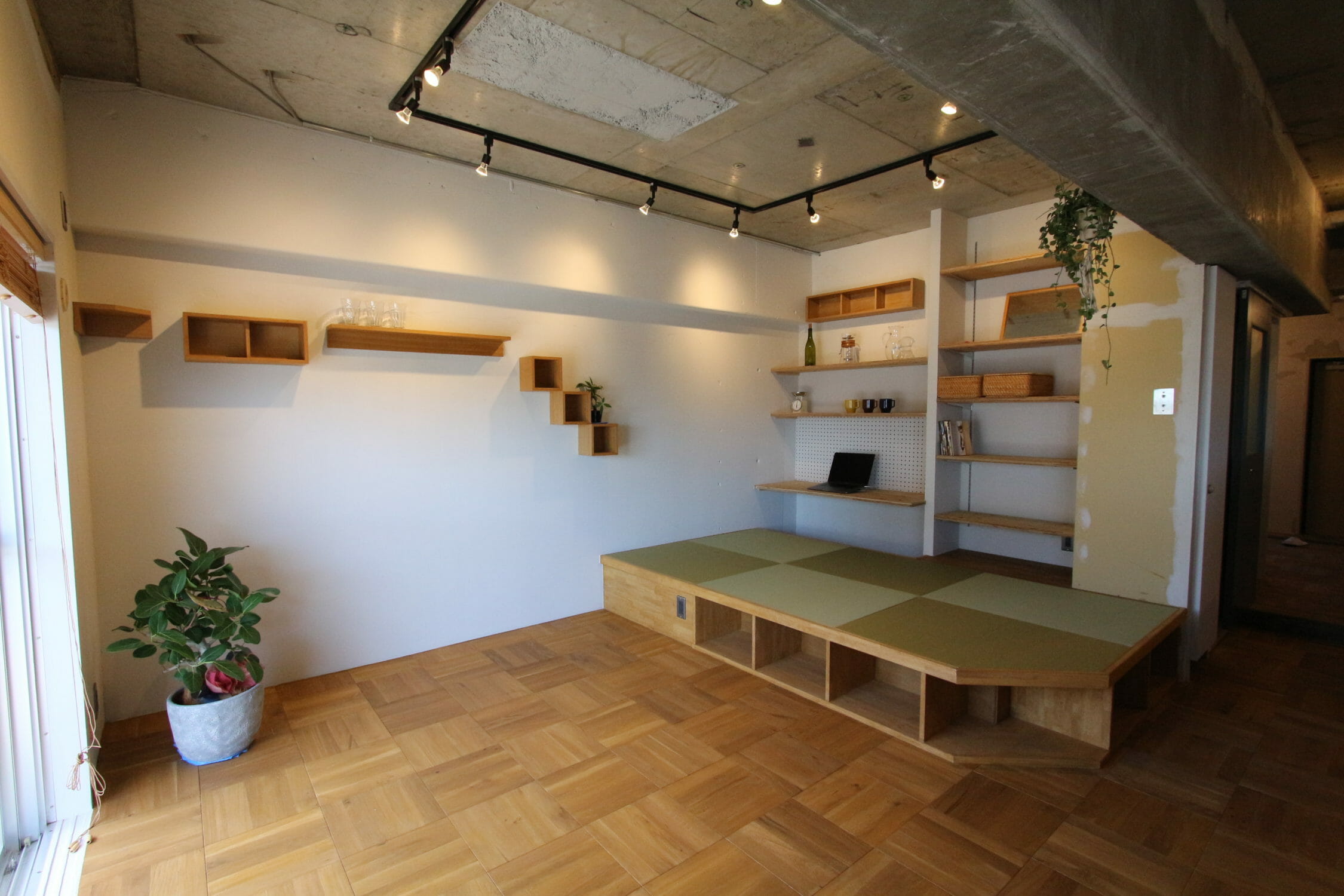 リビングの一角に設けられた小上がり空間はごろんと寝転べるゴロゴロ空間。作業台は足を下せるようになっているので、ここで勉強したり、PCしたりワークスペースとしても活躍しそうですね🤩。壁が有効ボードになっているので壁面収納も出来、大変便利な空間です。壁に付けられた棚は将来猫ちゃんの遊び場としても活躍しそうですね🐈💕