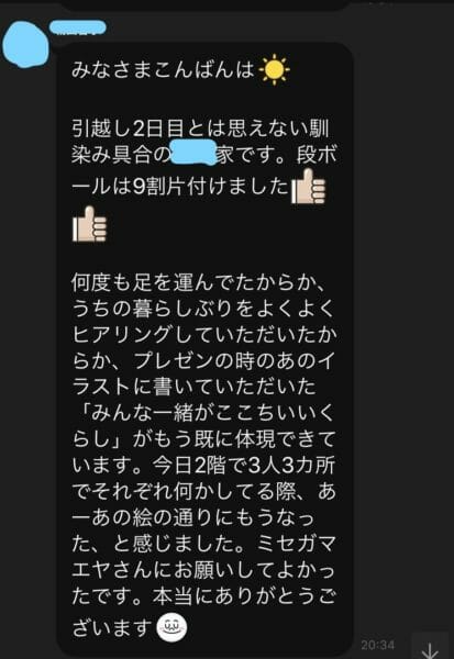 そしてA様よりこんなお言葉を頂きました。喜んで頂けて本当に良かったです!これからはこだわりぬいたこちらのお宅で、叶えたかった暮らしを存分に満喫してくださいね🥰