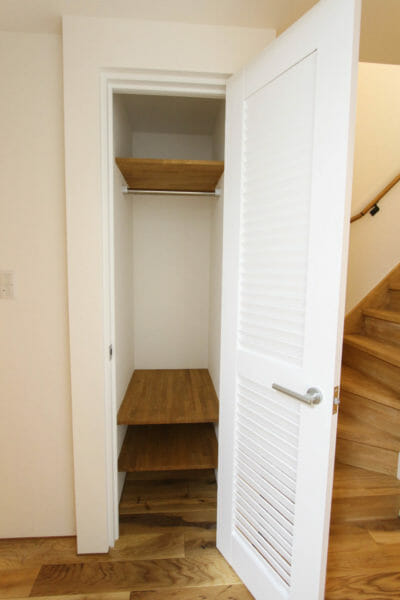 そのお隣には収納スペースがあります。コートもかけれますし、下の段には靴も置けます。