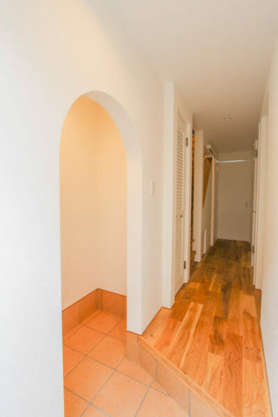 玄関を入ると、すぐ左手に空間があり自転車を置いたり荷物を置いたりする空間があります。このアーチが優しくかわいいですよね。