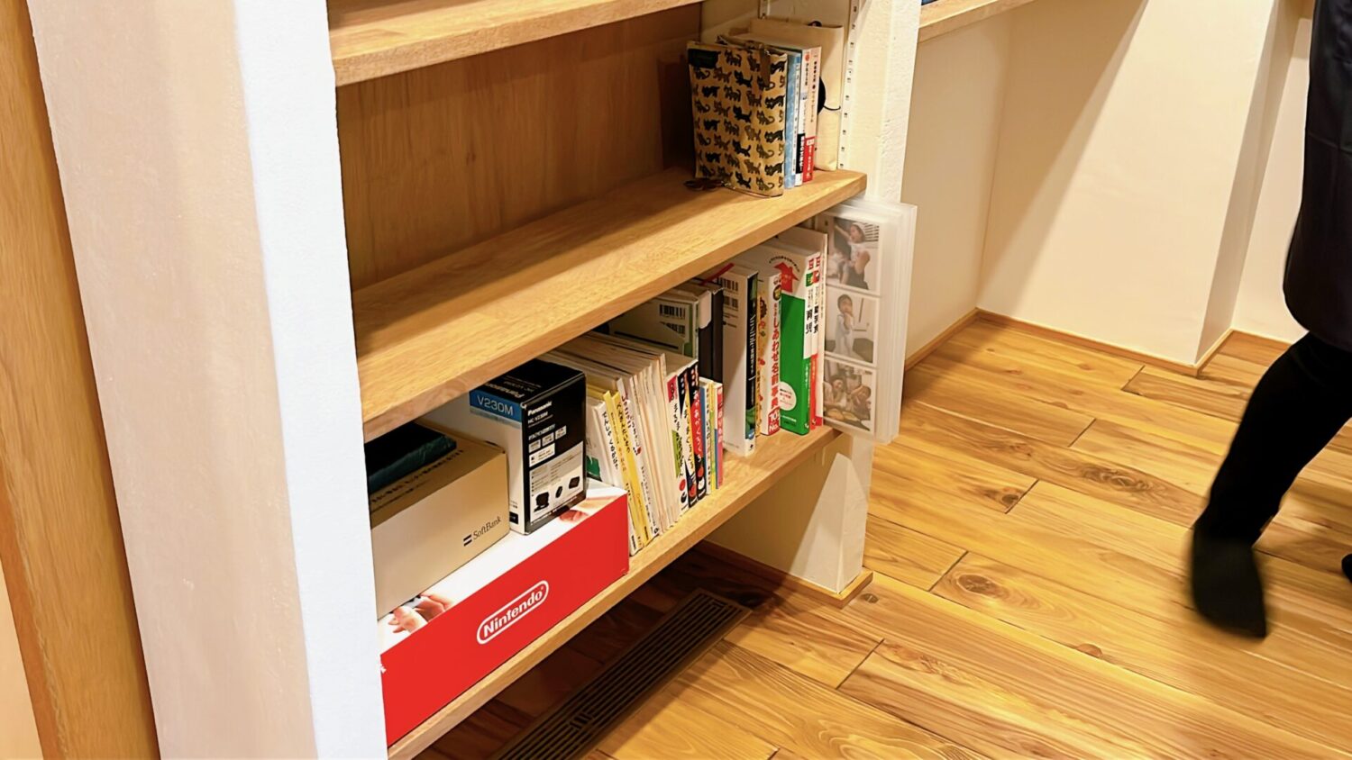 ↑まずはこちらの本棚収納。よ~く見ていただくと、お子様の絵本は一番下に収納されています。これは小さなお子様でもひとりで絵本を楽しめるための配慮です📚💛