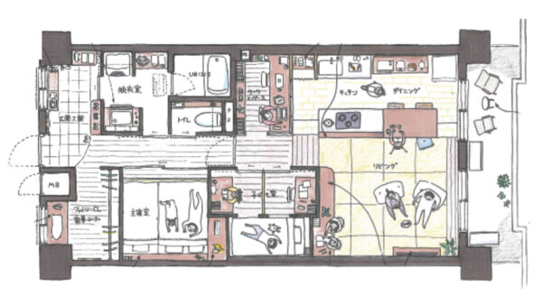 | ・どろんこになって帰ってきても大丈夫!玄関速攻洗面所。 ・家族の服はすべてここで完結!ファミリーWIC ・キッチンすぐ横ダイニングで料理の配膳楽々に♪ ・お手伝いしたくなる◎絶対に混雑しない回遊キッチン。 ・「適材適所」の収納だから家族みんなで家事を分担! ・ワークスペースがあるから仕事用具があちこちに散らかりません。 |