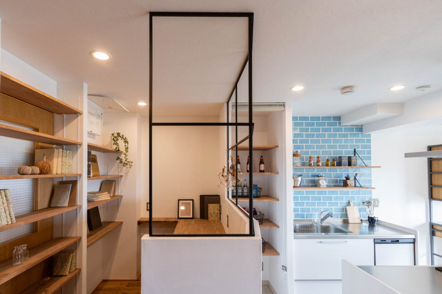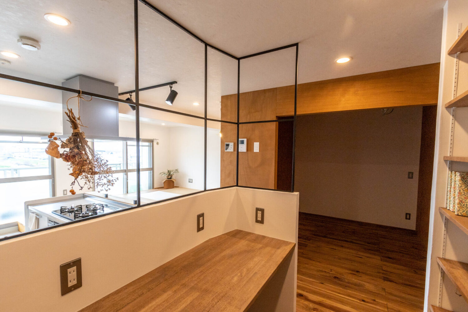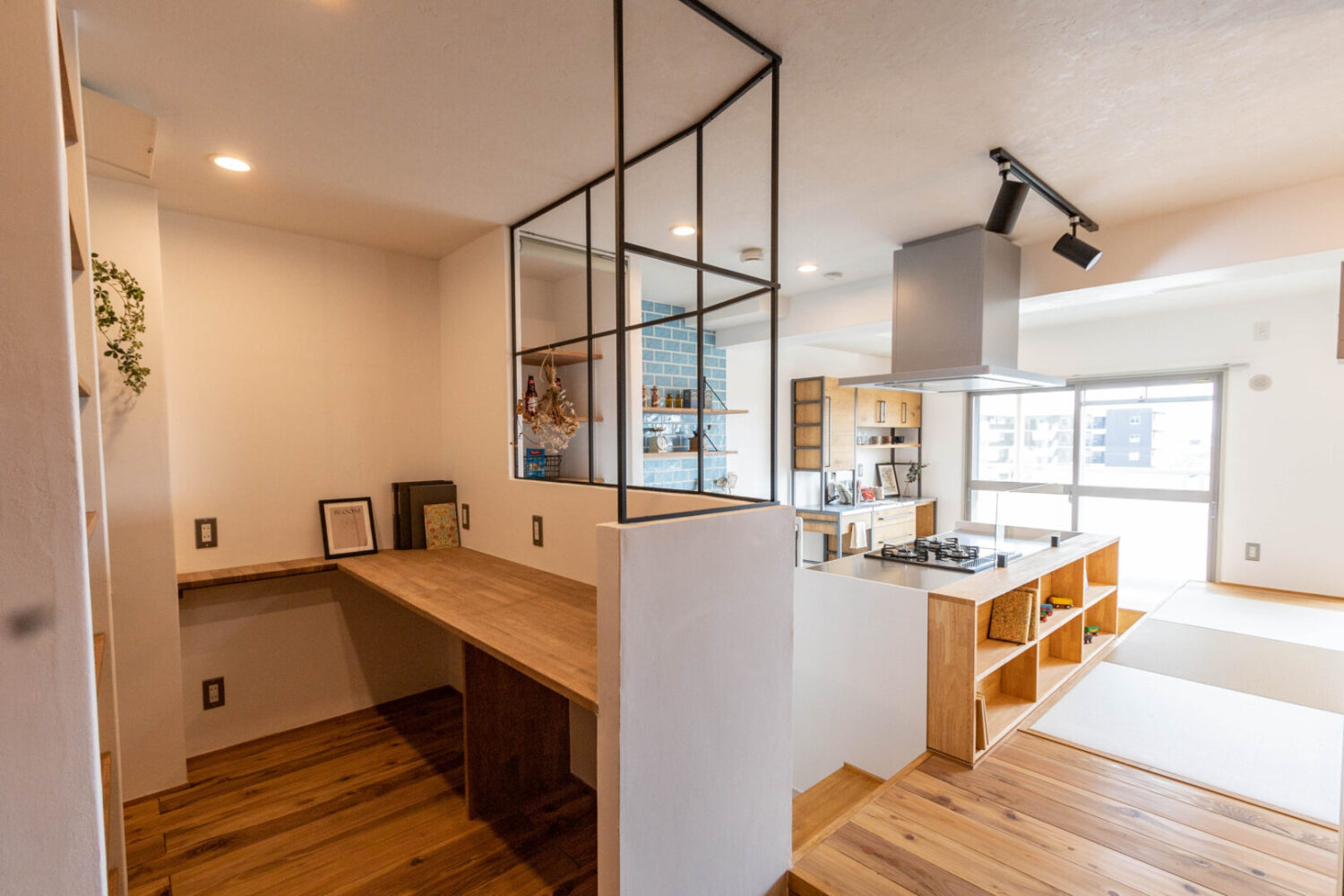 そしてワークスペースからは、こんな風にキッチンやダイニングの様子を見ていただくことができるので、在宅でお仕事をしているときでも、リビングで遊ぶお子様の様子を見ながら作業をすることができるので安心です◎