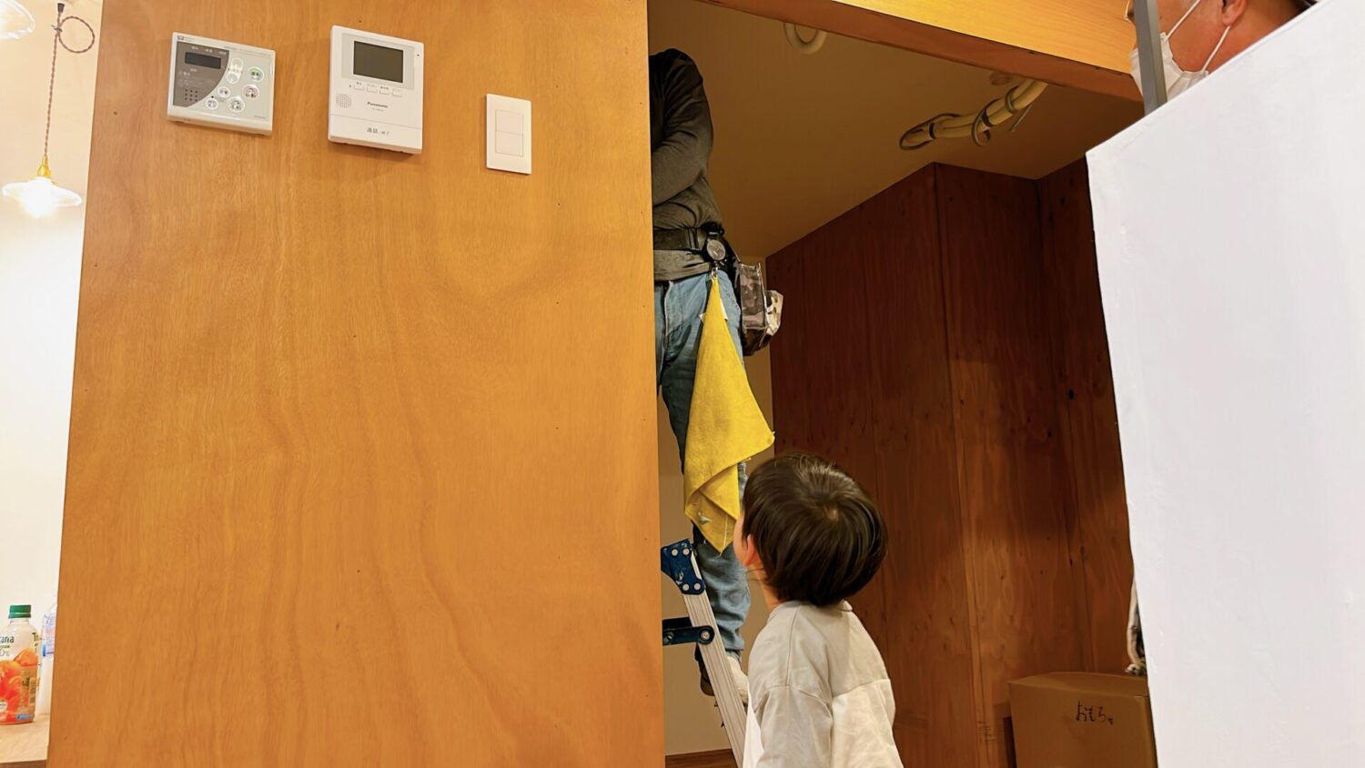 引き渡しの際にメンテナンスに来ていた職人さんの仕事ぶりを、しっかりチェックしてくれているお子様。