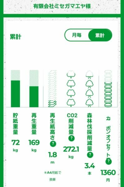 こうして可視化できるので、より気を付けようという気持ちにもなります。ミセガマエヤでは不要なコピー用紙を「ぐしゃっと丸めてポイ」は、ほぼありません。