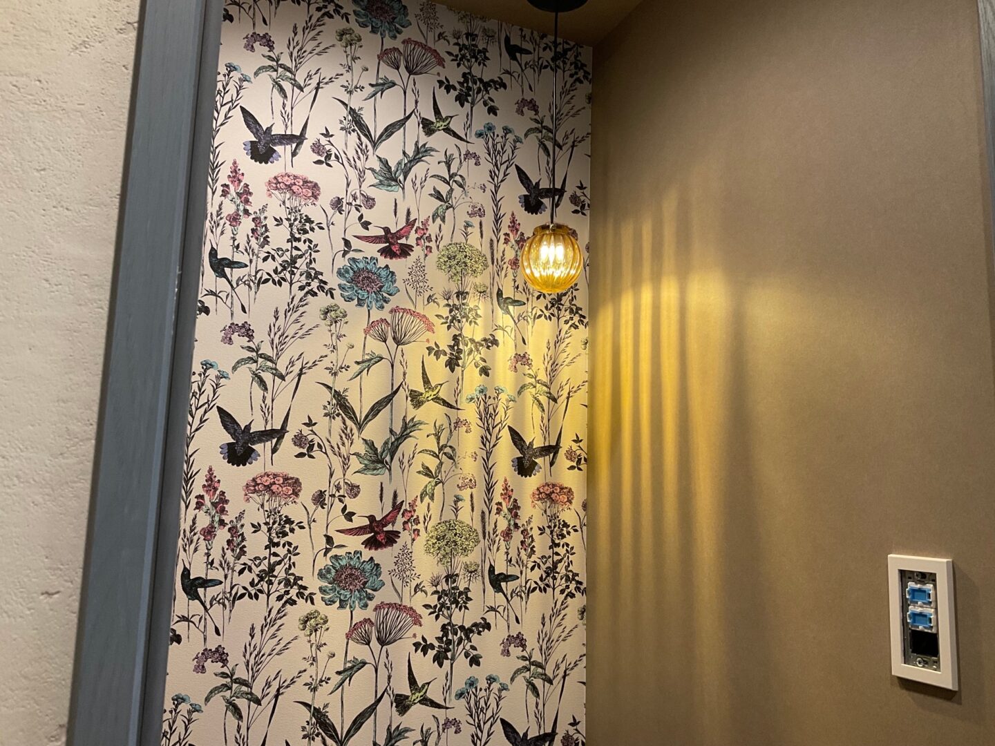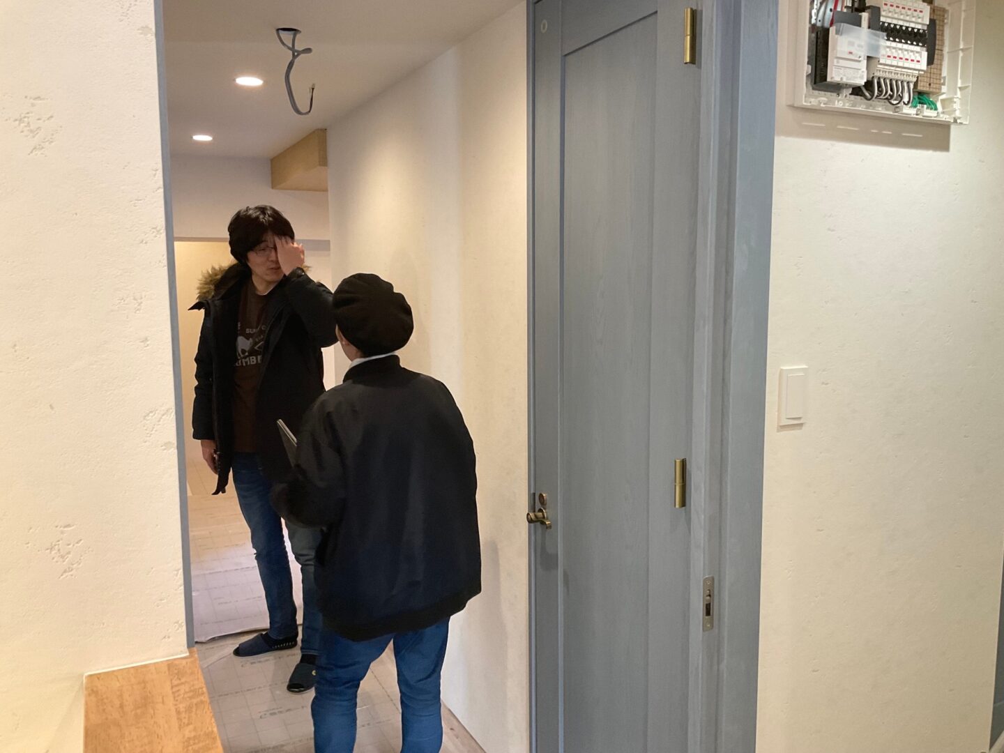 設計士の清水さんと共にチェックをしながら現場を確認!!クロスや家具が入ると一気に雰囲気が出てワクワクも増します!!この淡い水色のドアかわいいなぁ♪