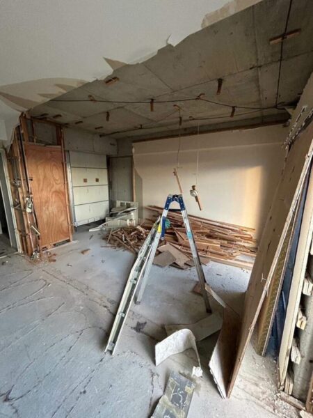 まずはフルスケルトンにするところから。間仕切り壁や天井など躯体(構造体のコンクリート)が見えるところまで解体していきます。😮