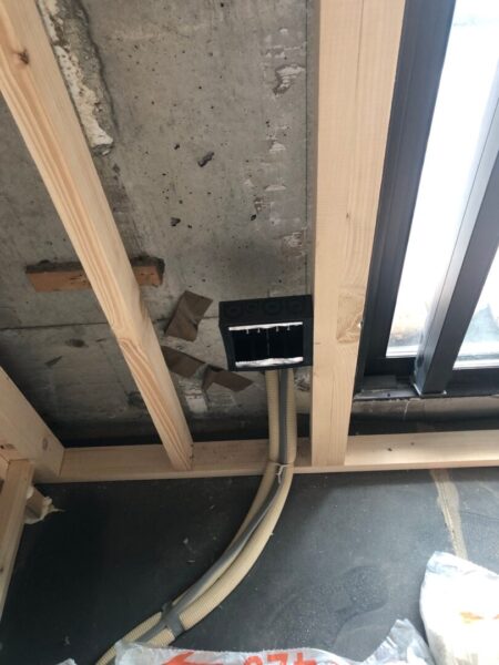 こちらは外壁に面するコンセントボックス。ただのコンセントボックスではなく防音用のもので、音が配管の中に入らないようにするためのボックスだそうです‼︎😮ほんとに細部まで考えて出来上がっていっているのだなと言うことを感じました!