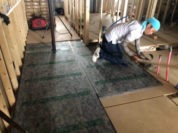 実は、こちら遮音マットと言いまして、音が外に漏れてしまうのを防ぐ効果が高いマットをお家全体に敷き詰めていきます。