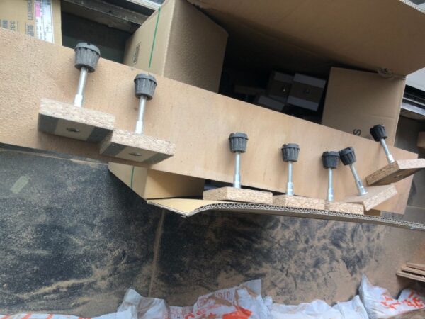この板はパーティクルボードという板。そのままマットの上に敷くわけではなく、束を立ててあえて空洞を作りところの上に板を敷いています。空洞部分にはたくさんのロックウールというものを詰め込んでいる構造になっています。このロックウールが騒音を防いでくれるのです!💡