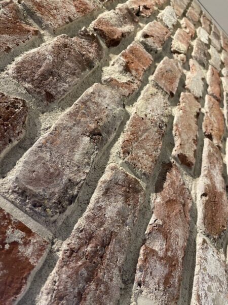 そしてこちらのレンガ。なんと本物です‼️最近では遠くからはレンガに見えるようないわゆるフェイク材も出てきています。本物かフェイクかどちらにしようか迷った時、フェイクだと安っぽく見えてしまう…と、思い切って本物のレンガを使おうと決断したそうです。そしてこのレンガは、ヨーロッパで風化して取り壊された建物の外壁のレンガだそうです。また、レンガの積み方にも拘っているそうです。ここにも社長のこだわりが見えますね。☺️