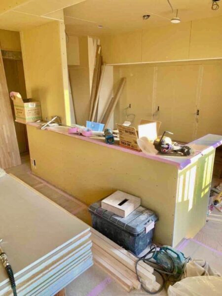 ↑こちらはキッチンのところのカウンター部分、カタチが出来上がってきました!ここにタイルが貼られると…