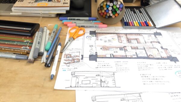 〝まず、プラニングした案を手がかりに平面図を作成します。広さや間隔などを調節しながら線を描いていきます。それが出来上がったら、あとはワクワクしてもらえるようなプレゼンボードを作成。💫また、図面でワクワクしてもらうことに重点を置きながらも、時間が許す限りはパースも描くようにしています。〟