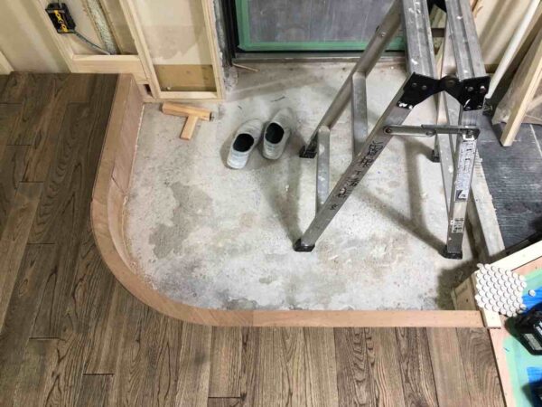 床が仕上がり、こちらは玄関の部分!框の曲線がとても可愛らしく仕上がっていますよね!😊