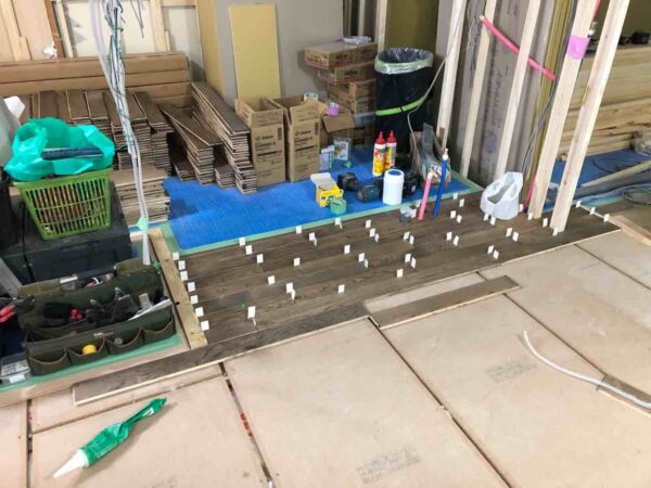 下地の上には1枚ずつ丁寧にフローリング材を敷き詰めていきます!!木材の収縮する特性を考慮して、スペーサーを挟んで丁寧にフローリングが並んでます♪