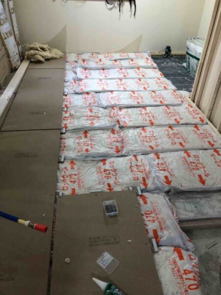 床にはロックウールをパンパンに敷き詰めて、その上にロックウールを押し込むよう並べていきます!