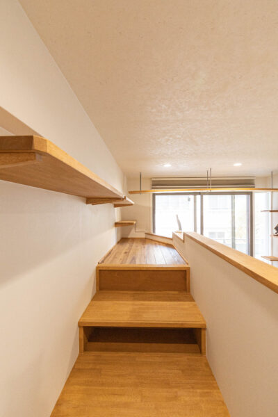 壁の後ろには収納付きの階段、その上と下には思い思いに過ごせるちょっとしたスペースが。