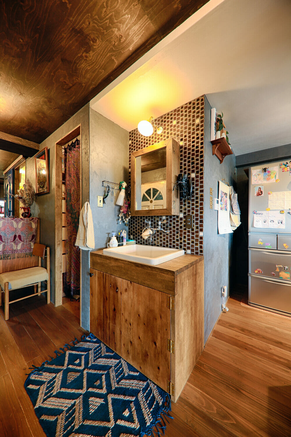 家の中心にあるオープンな洗面台。閉じられていないスペースが、意外にも便利だったそうです。