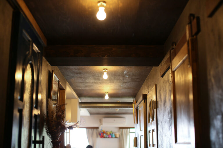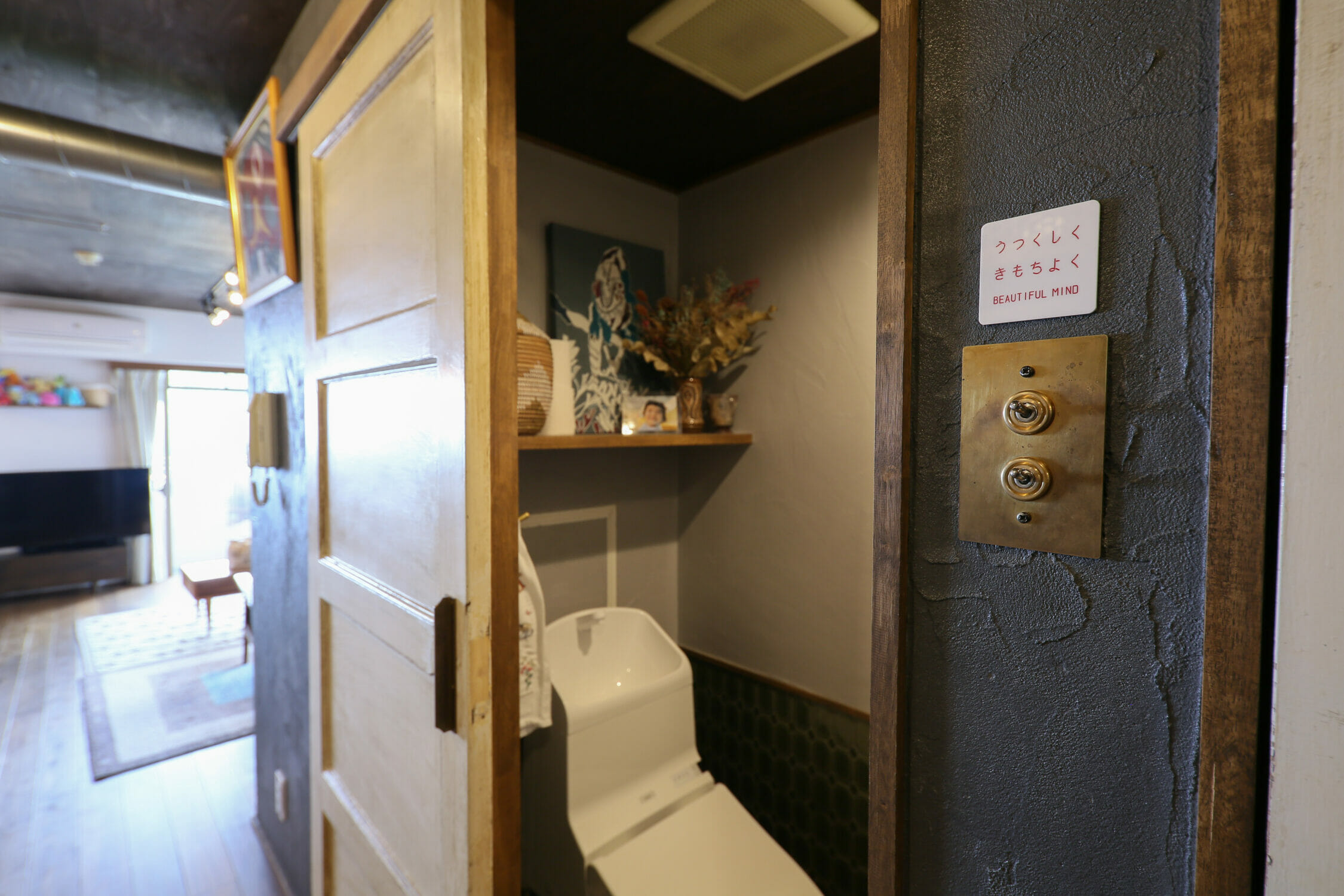 トグルスイッチやソケット照明、DIYで施工したグレーの漆喰やお絵描きができるペイント扉など、細部にまでこだわりが詰まっており、その完成度は、まるで映画のセットに迷い込んだような雰囲気を醸し出しています。
