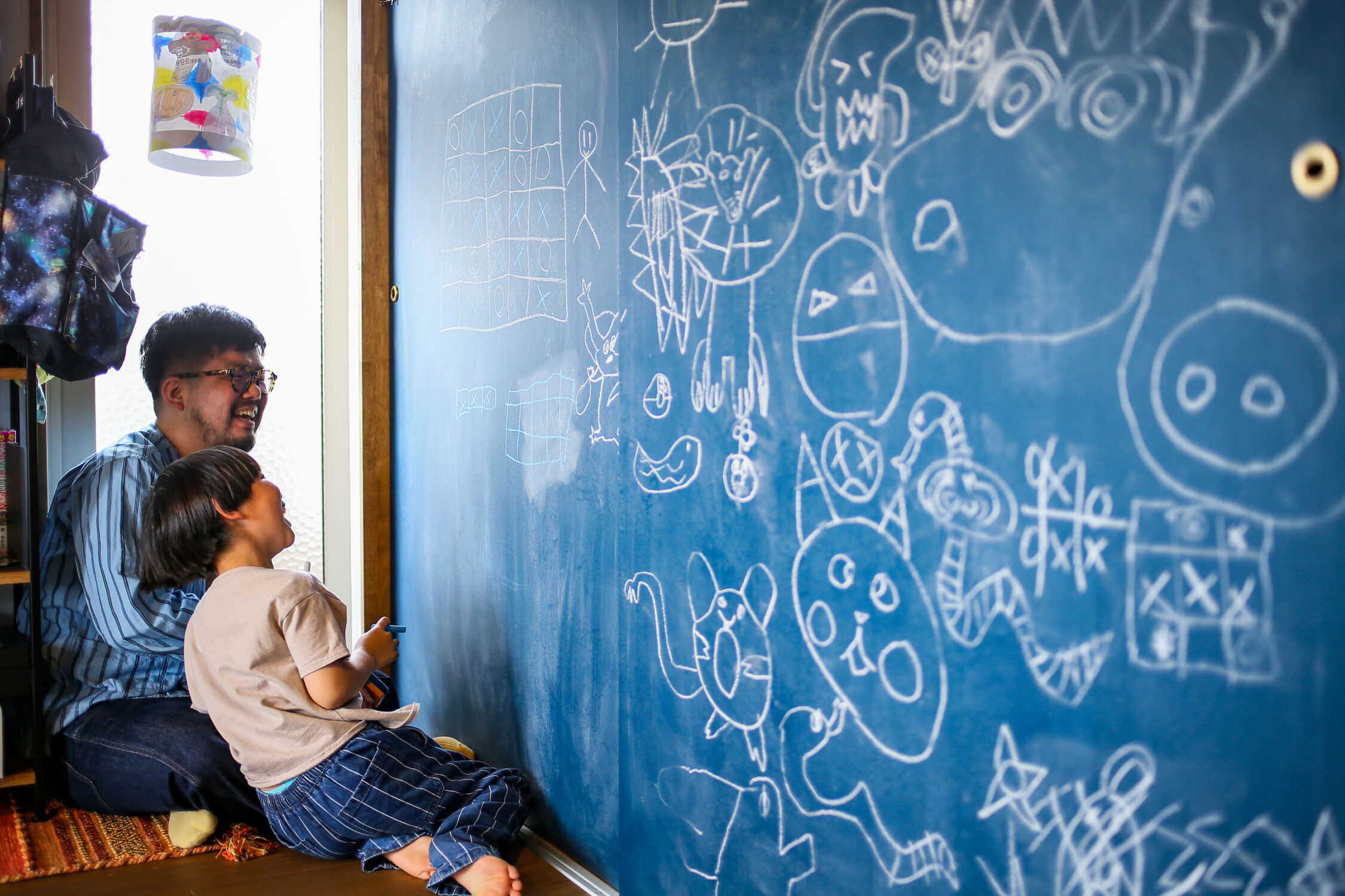 お絵描きできる収納の扉には、黒板塗料をDIYで塗装。深みのあるブルーが落ち着いた色の空間によく似合います。
