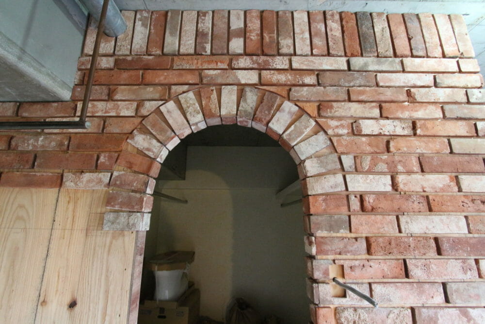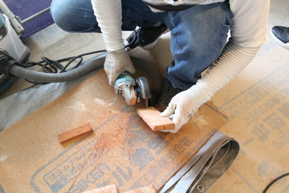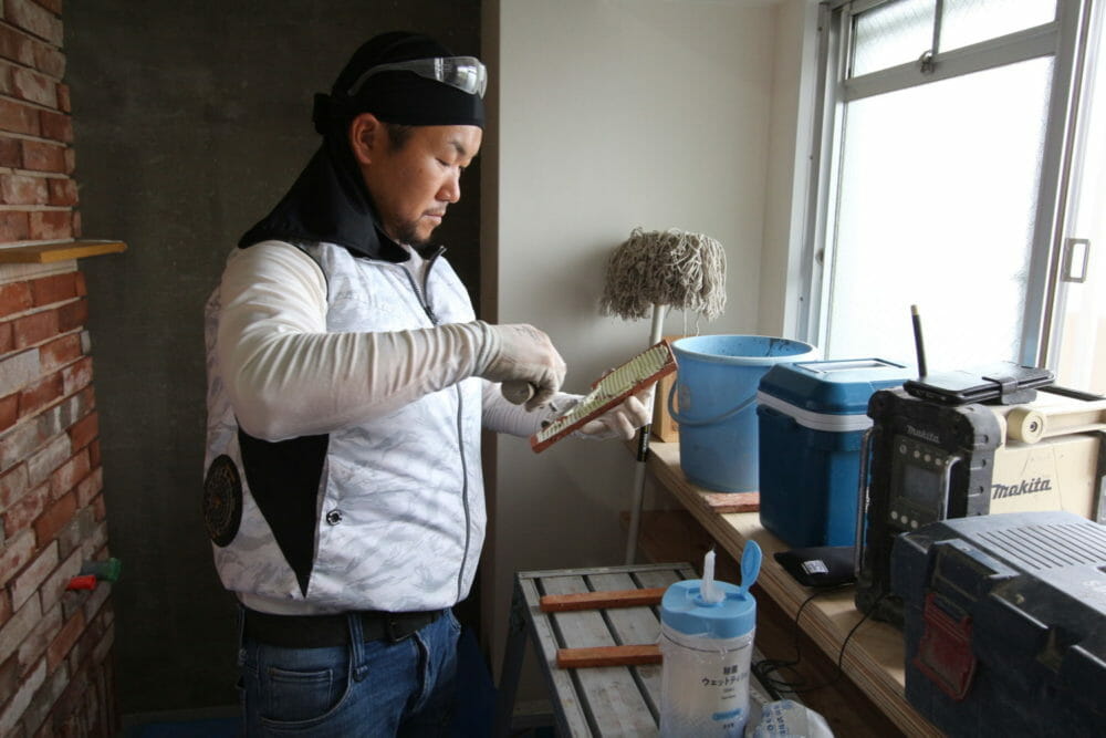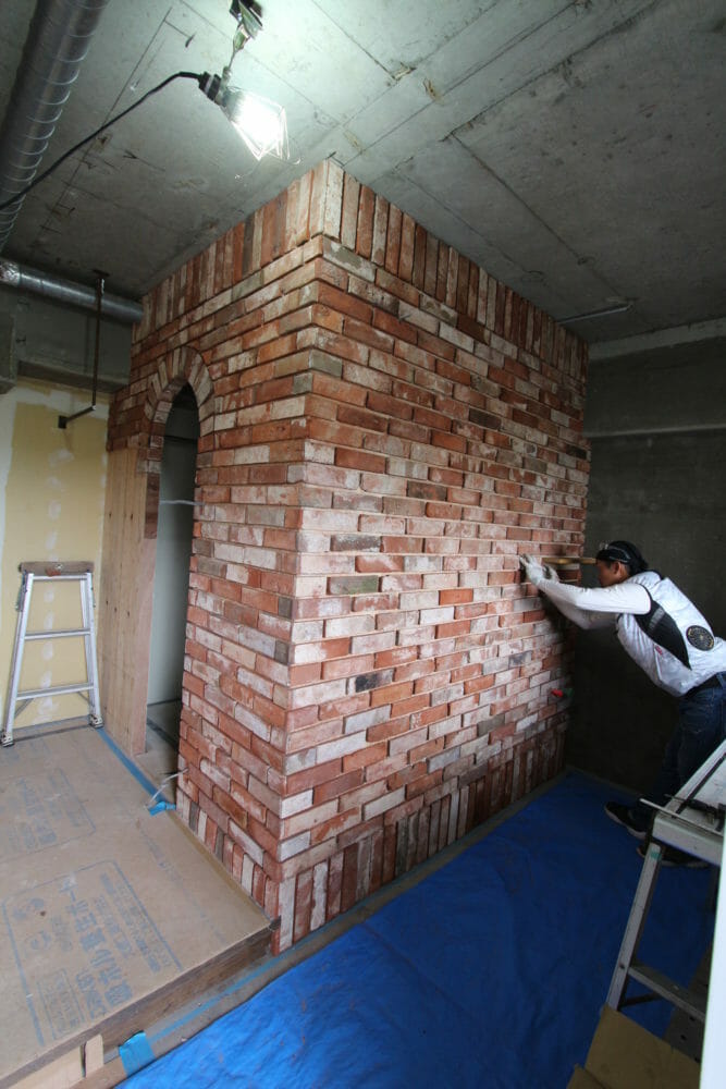 「職人さんがレンガタイルを貼っている真っただ中やで!」