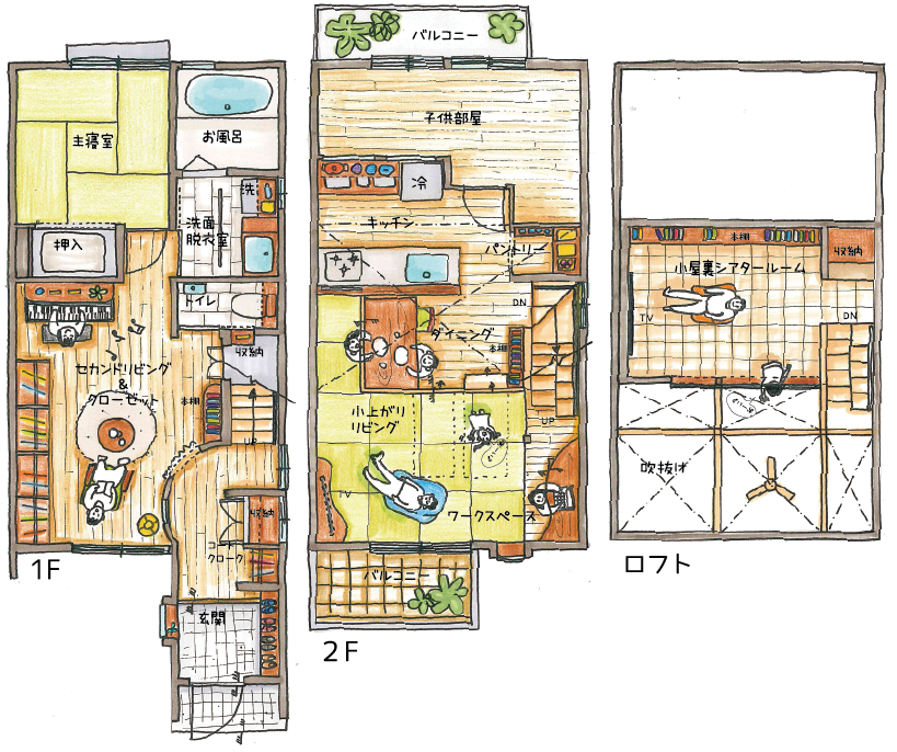 コンパクトながらも開放感のある小上がりリビングは小屋裏のシアタールームと楽しく繋がったり、ちょっと気分を変えたいときは1Fのクローゼットを兼ねたセカンドリビングへ。