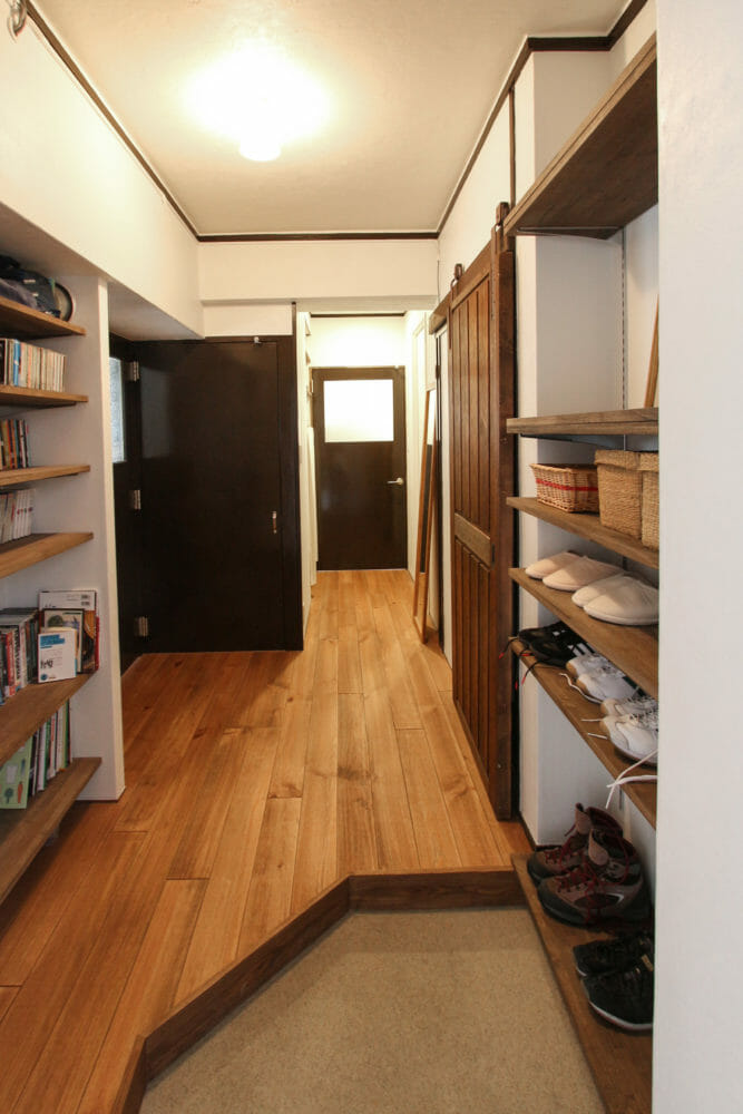 ウォルナット色に塗装したボルドーパインの無垢フローリング。