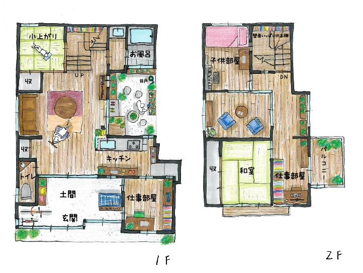 思い切って広々と確保した土間では、趣味で作った雑貨のショップをすることも。ここではお子様がプール遊びをすることもできます。