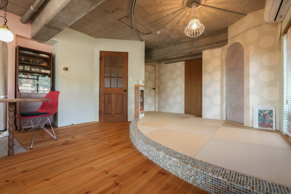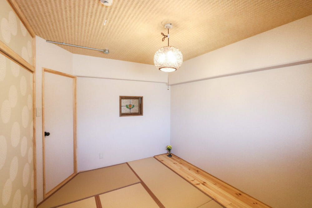 菊柄のふすまやアンティークのステンドグラスがマッチした、モダンながらも落ち着く和室。