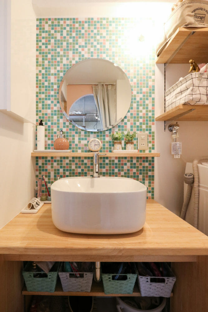 I様の大好きなミントグリーンとピンクを使ったカラフルな洗面。朝の仕度が楽しくなります。