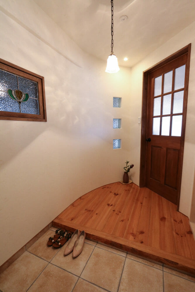 アンティークのステンドグラスやガラスブロックをはめ込んだ玄関。殺風景だった玄関が柔らかさと温かさのある空間に変身しました。