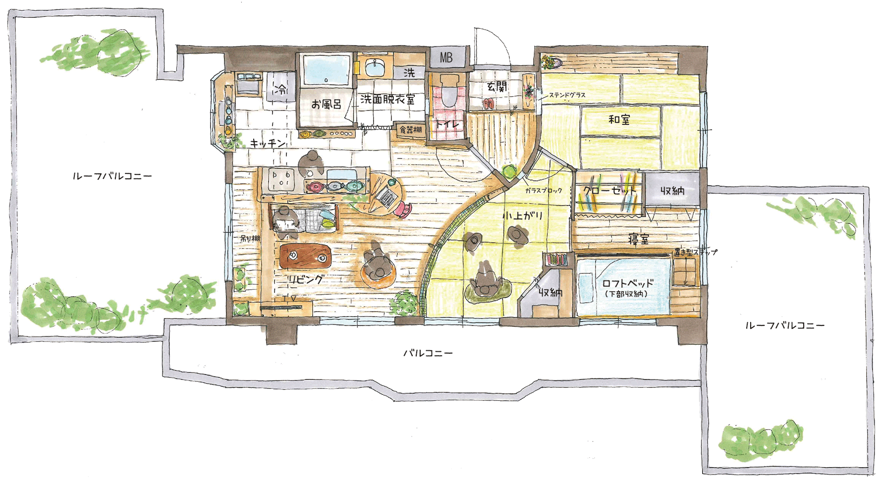 小上がりの畳やソファーやキッチンなど、居場所がいっぱいできたI様邸。家族や友人たちが集まって、ゆっくりくつろげる場所にしたいそうです。