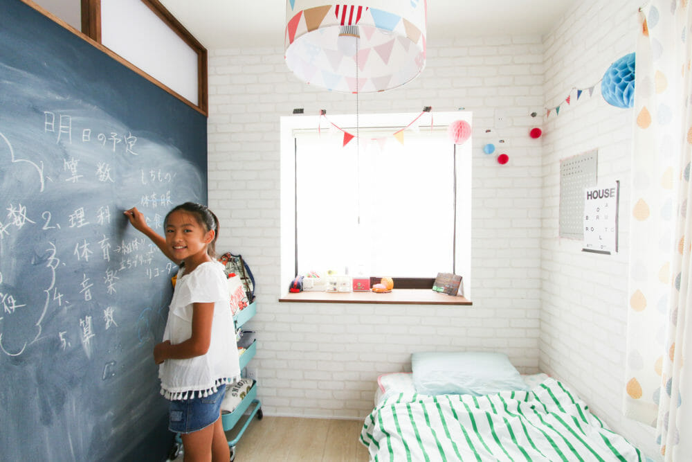 遊びに来たお友達から「おしゃれ」と羨ましがられるKちゃんの部屋。黒板クロスに自由に絵を描いたり、思いついたことを書きとめたり、想像力がどんどん高まります。