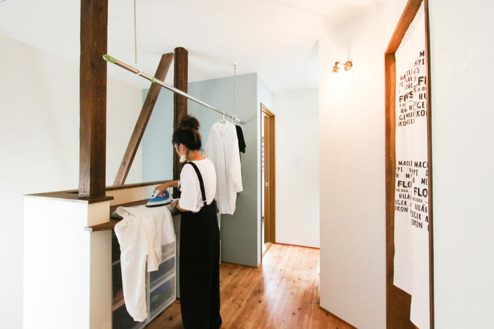必要な時に室内干しが出来るバーを取り付けた家事スペース。 アイロン掛けしたら家族の衣類はまとめてファミリークローゼットへ。