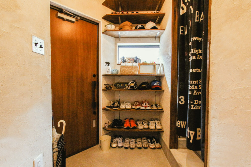 玄関には帰宅後すぐにリビングにいる家族の温かい気配が感じられる小窓を取り付けました。