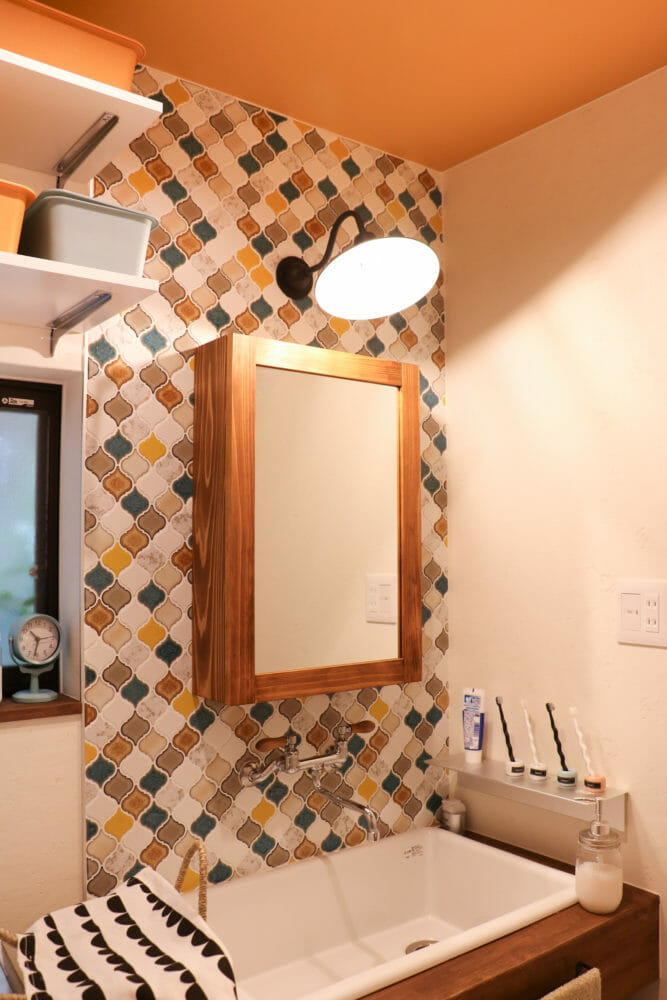 大きなタライがすっぽり入る実験用シンクはつけ置き洗いに大活躍♪ カラフルで楽しい洗面脱衣室になりました。