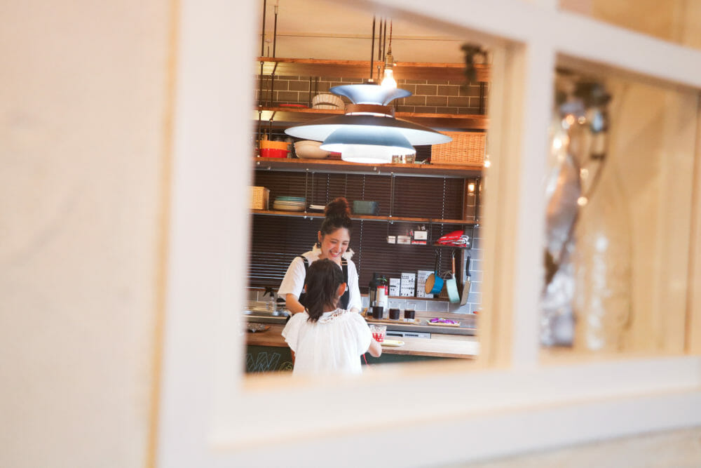 掘り込み式の丸テーブルに座っている人とキッチンに立つ人の目線に違和感が出ないよう、キッチンの床を一段下げました。