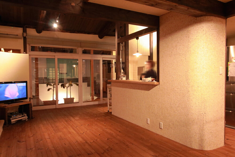 京町家は柱と梁の存在で直線的な雰囲気になりがちなので 曲線を使った壁にすることで柔らかな空気感を生み出しました。 実は、曲線の壁を使うと人の移動もスムーズになるんです!