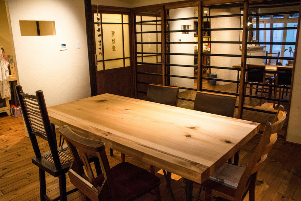 無垢板と鉄足で作っただけのシンプルなダイニングテーブル友人やご近所さんが来られてもリラックスした場の空気があれば話がはずみます。